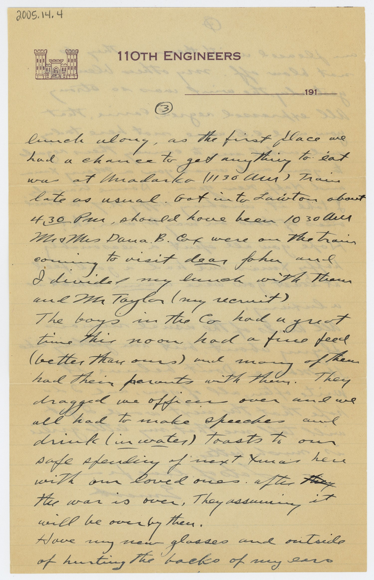 [110th Engineers letterhead] [page 3] lunch along, as the first place we had a chance to get anything to eat was at Anadarka (1130 AM) Train late as usual. Got into Lawton about 430 PM, should have been 1030 AM Mr & Mrs Dana B. Cox were on the train coming to visit dear John and I divided my lunch with them and Mr Taylor (my recruit) The boys in the Co had a great time this noon, had a fine feed (better than ours) and many of them had their parants with them. They dragged we officers over and we all had to make speeches and drink (in water) toasts to our safe spending of next Xmas here with our loved ones after the war is over. They assuming it will be over by then. Have my new glasses and outside of hurting the backs of my ears