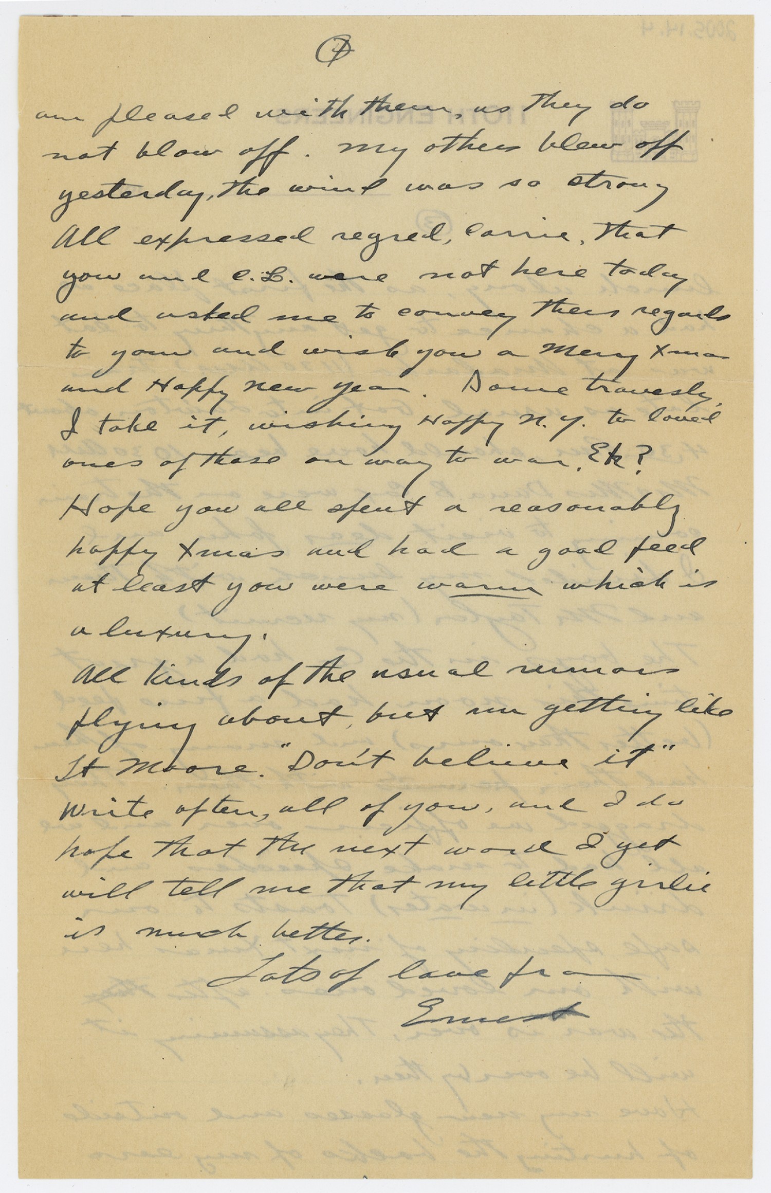 [page 4] am pleased with them, as they do not blow off. My others blew off yesterday, the wind was so strong all expressed regred, Carrie, that you and C.L. were not here today and asked me to convey their regards to you and wish you a Mery Xmas and Happy New Year. Some travesty, I take it, wishing Happy N.Y. to loved ones of those on way to war. Eh? Hope you all spent a reasonably happy Xmas and had a good feed at least you were warm which is a luxury. All kinds of the usual rumors flying about, but am getting like Lt Moore.