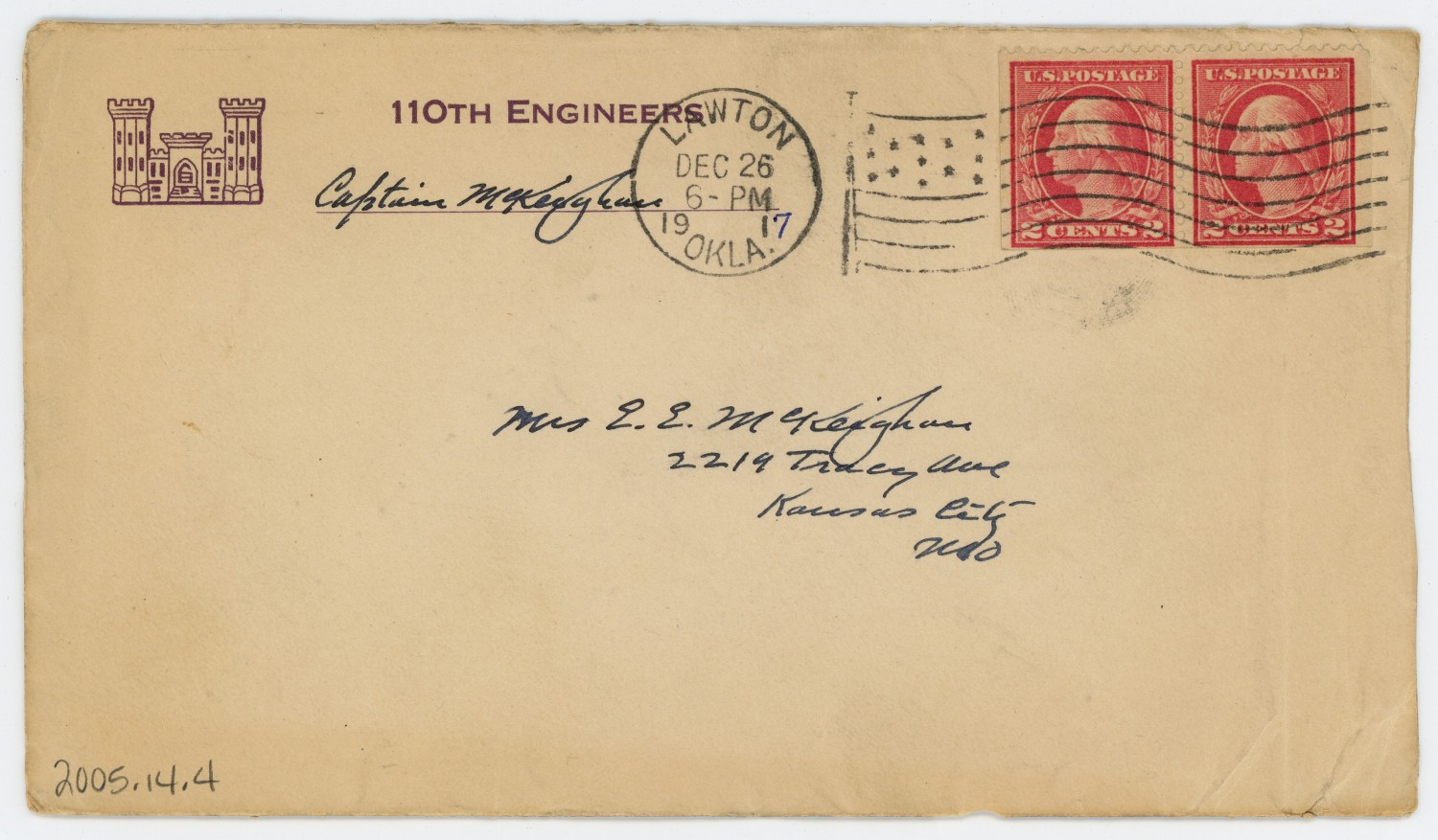 110TH ENGINEERS Captain McKeighan LAWTON [December] 26 1917 6 - PM [Oklahoma] [stamp] Mrs E.E. McKeighan 2219 Tracy Ave Kansas City [Missouri]