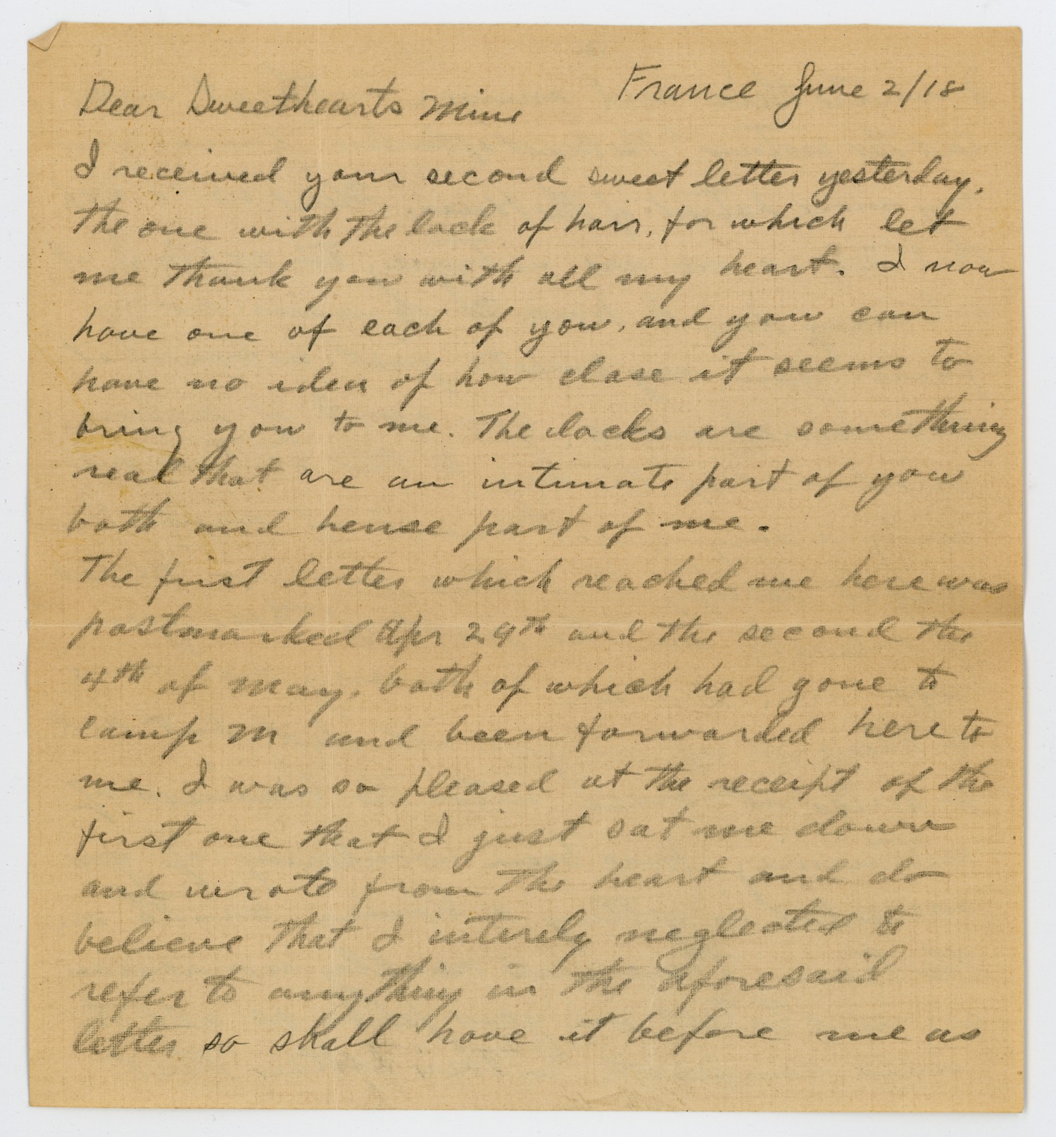 France June 2 [1918] Dear Sweethearts Mine I received your second sweet letter yesterday, the one with the lock of hair, for which let me thank you with all my heart. I now have one of each of you, and you can have no idea of how close it seems to bring you to me. The locks are something real that are an intimate part of you both and hense part of me. The first letter which reached me here was postmarked [April] 29th and the second the 4th of May, both of which had gone to camp M and been forwarded here to me. I was so pleased at the receipt of the first one that I just sat me down and wrote from the heart and do believe that I interely neglected to refer to anything in the aforesaid letter so shall have it before me as