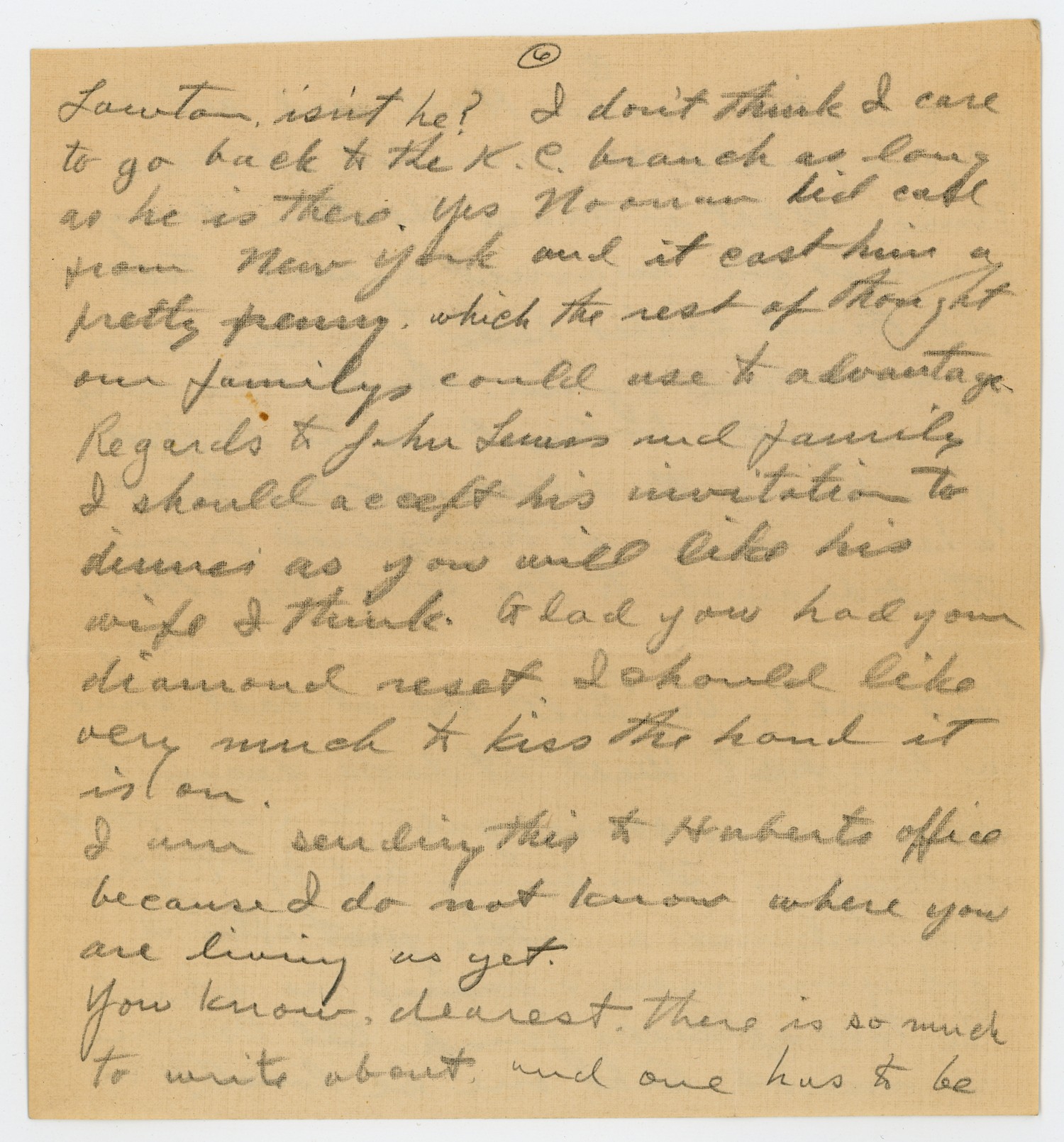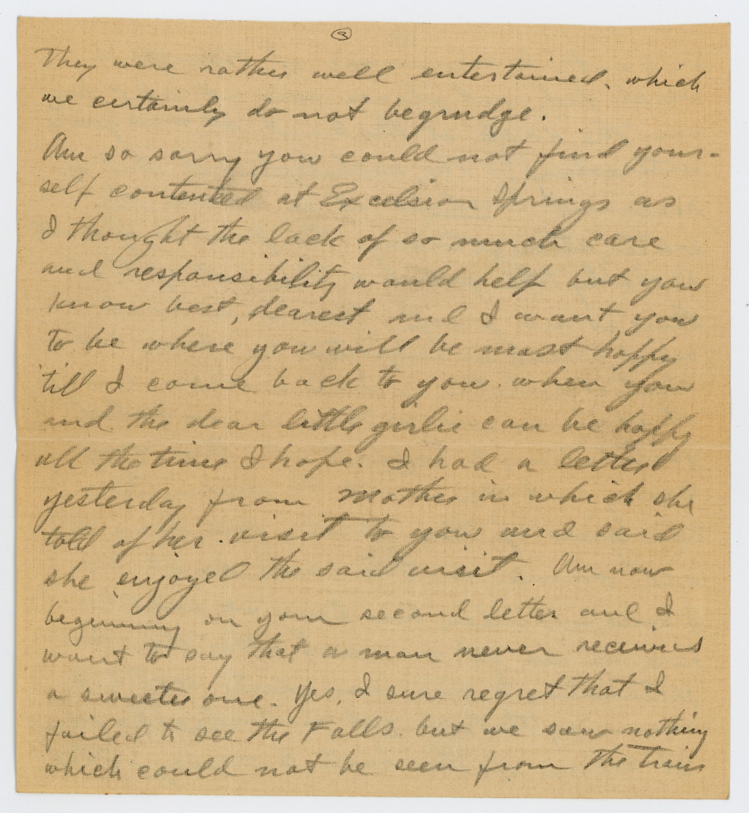 [page 3] They were rather well entertained, which we certainly do not begrudge. Am so sorry you could not find yourself contented at Excelsior Springs as I thought the lack of so much care and responsibility would help but you know best, dearest and I want you to be where you will be most happy