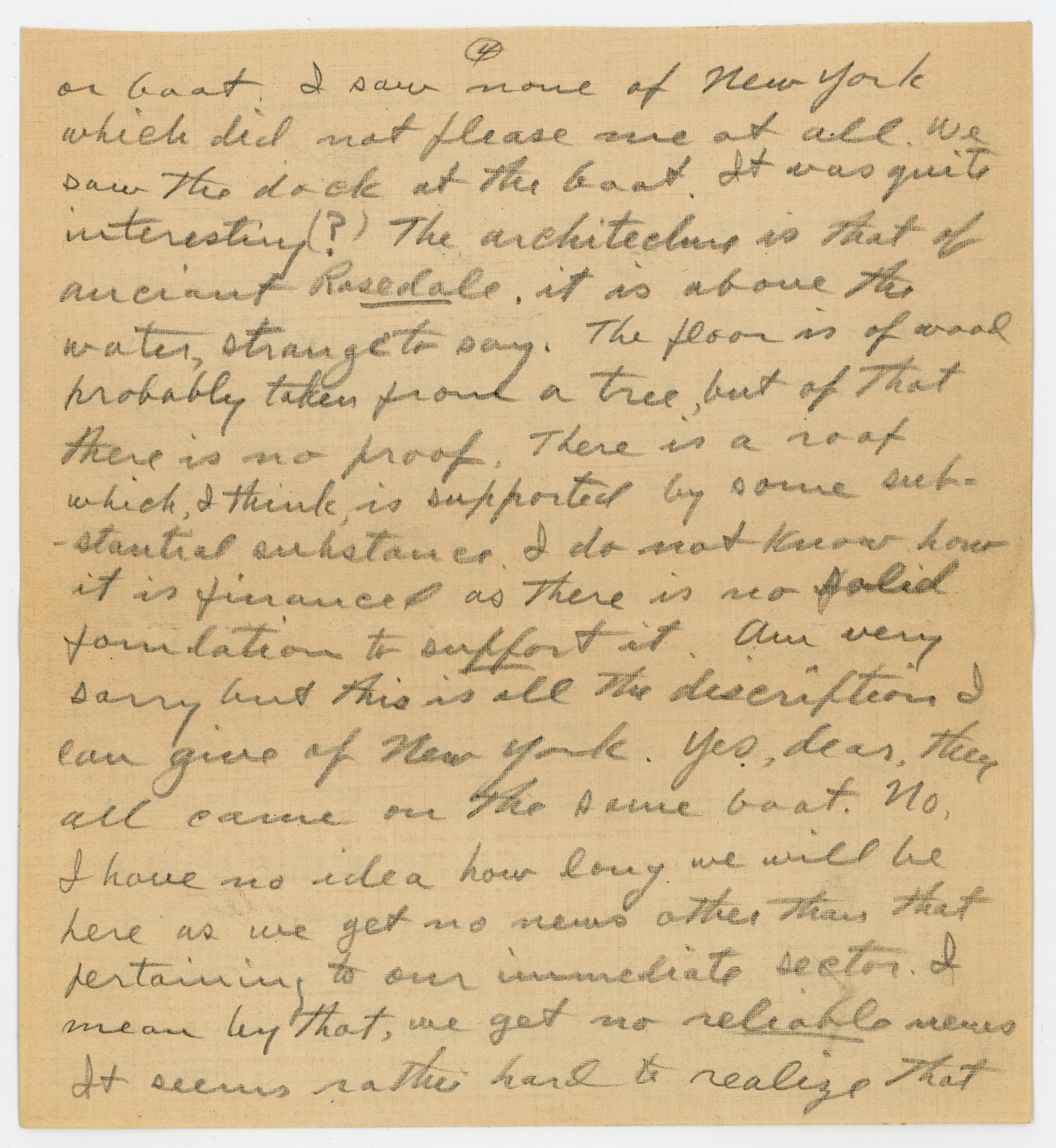 [page 4] or boat. I saw none of New York which did not please me at all. We saw the dock at the boat. It was quite interesting (?) The architecture is that of ancient Rosedale, it is above the water, strange to say. The floor is of wood probably taken from a tree, but of that there is no proof. There is a roof which, I think, is supported by some substantial substance. I do not know how it is financed as there is no solid foundation to support it. Am very sorry but this is all the description I can give of New York. Yes, dear, they all came on the same boat. No, I have no idea how long we will be here as we get no news other than that pertaining to our immediate sector. I mean by that, we get no reliable news It seems rather hard to realize that