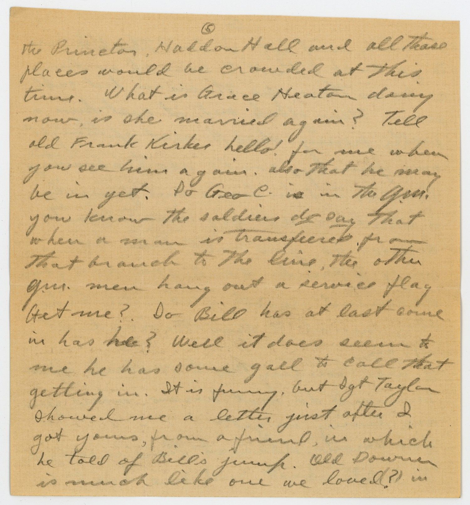 [page 5] the Princton, Haddon Hall and all those places would be crowded at this time. What is Grace Heaton doing now, is she married again? Tell old Frank Kirkes hello! for me when you see him again, also that he may be in yet. So Geo C. is in the Q.M. you know the soldiers do say that when a man is transferred from that branch to the line, the other Q.M. men hang out a service flag Get me? So Bill has at last come in has he? Well it does seem to me he has some gall to call that getting in. It is funny, but Sgt Taylor showed me a letter just after I got yours, from a friend, in which he told of Bill