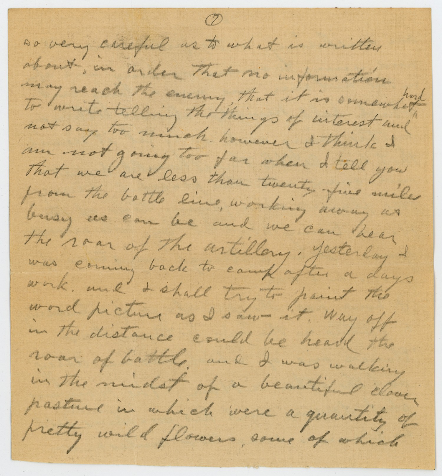 [page 7] so very careful as to what is written about, in order that no information may reach the enemy, that it is somewhat hard to write telling the things of interest and not say too much, however I think I am not going too far when I tell you that we are less than twenty-five miles from the battle line, working away as busy as can be and we can hear the roar of the artillery. Yesterday I was coming back to camp after a days work, and I shall try to paint the word picture as I saw it. Way off in the distance could be heard the roar of battle, and I was walking in the midst of a beautiful clover pasture in which were a quantity of pretty wild flowers, some of which
