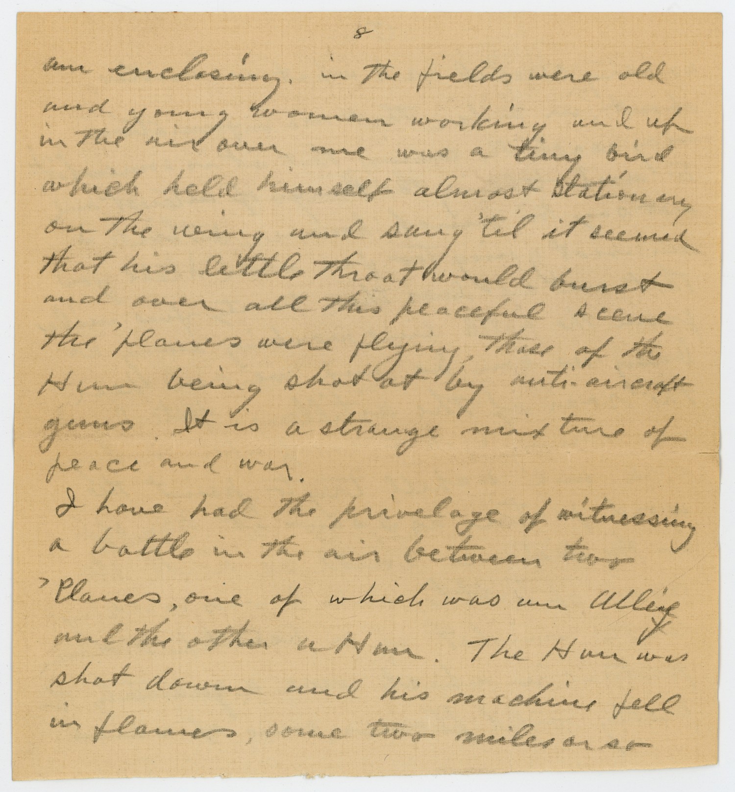 [page 8] am enclosing, in the fields were old and young women working and up in the air over me was a tiny bird which held himself almost stationary on the wing and sang