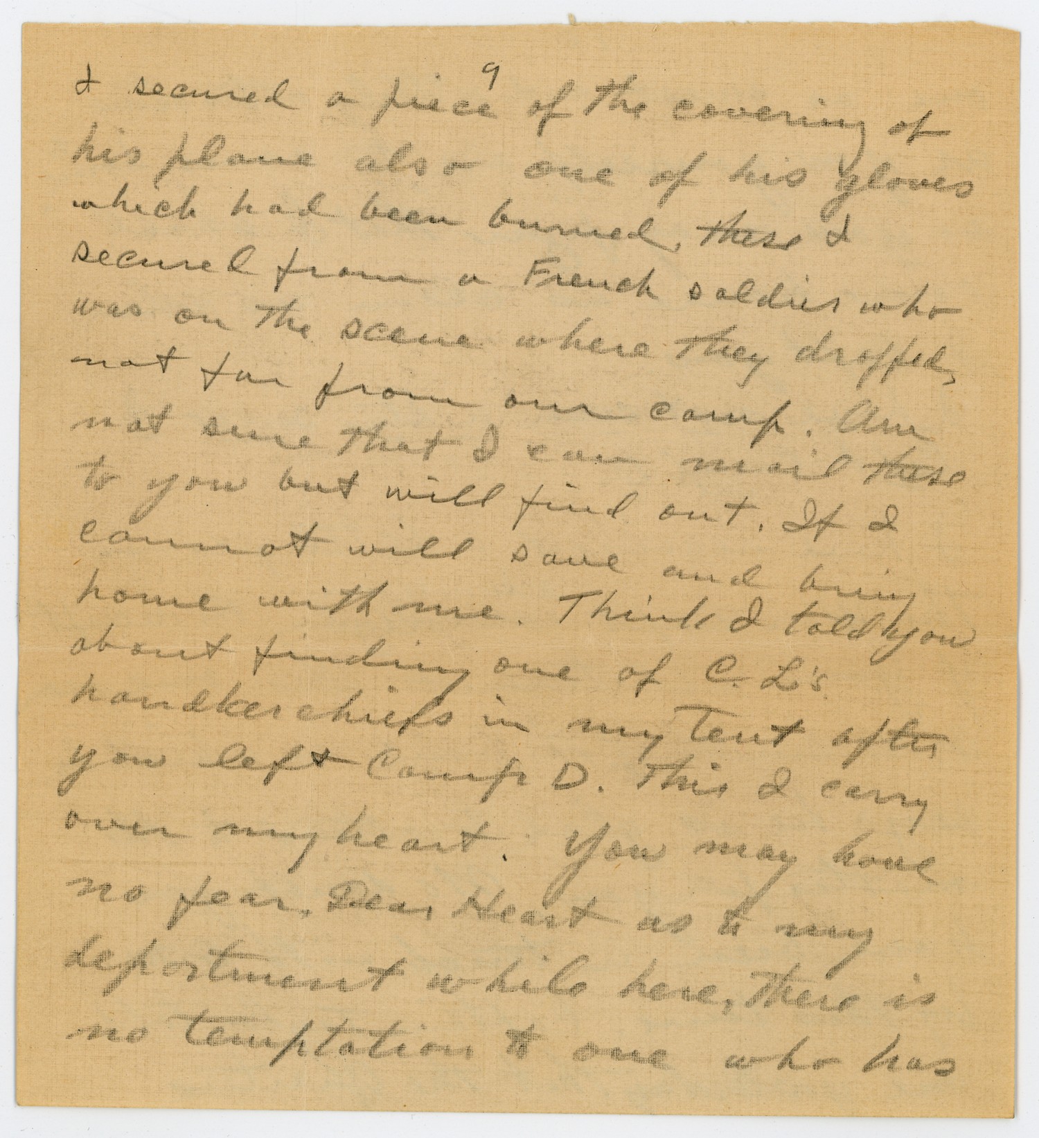 [page 9] I secured a piece of the covering of his plane also one of his gloves which had been burned, these I secured from a French soldier who was on the scene where they dropped not far from our camp Am not sure that I can mail these to you but will find out. If I cannot will save and bring home with me. Think I told you about finding one of C.L