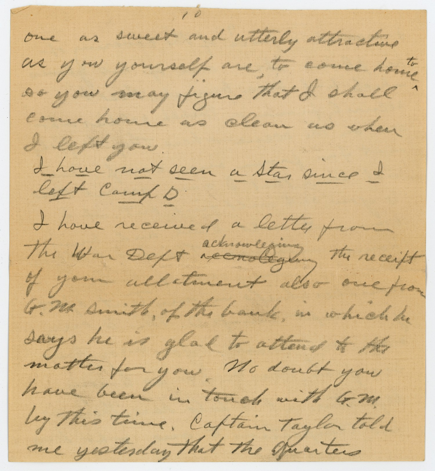 [page 10] one as sweet and utterly attractive as you yourself are, to come home to so you may figure that I shall come home as clean as when I left you. I have not seen a Star since I left Camp D I have received a letter from the War Dept acknowledging the receipt of your allotment also one from G.M. Smith, of the bank, in which he says he is glad to attend to the matter for you. No doubt you have been in touch with G.M. by this time. Captain Taylor told me yesterday that the Quarters