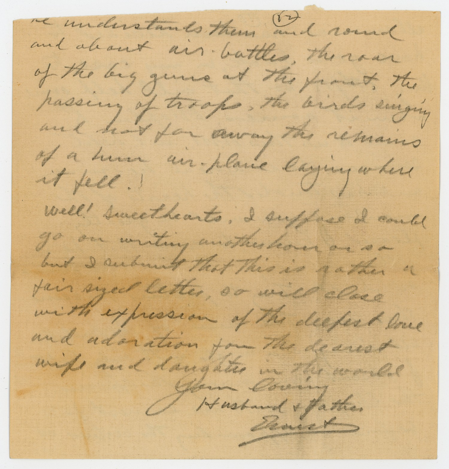 [page 12] he understand them and round and about air-battles, the roar of the big guns at the front, the passing of troops, the birds singing and not for away the remains of a hun air-plane laying where it fell. Well! sweethearts, I suppose I could go on writing another hour or so but I submit that this is rather a fair sized letter, so will close with expression of the deepest love and adoration for the dearest wife and daughter in the world Your loving Husband & Father Ernest