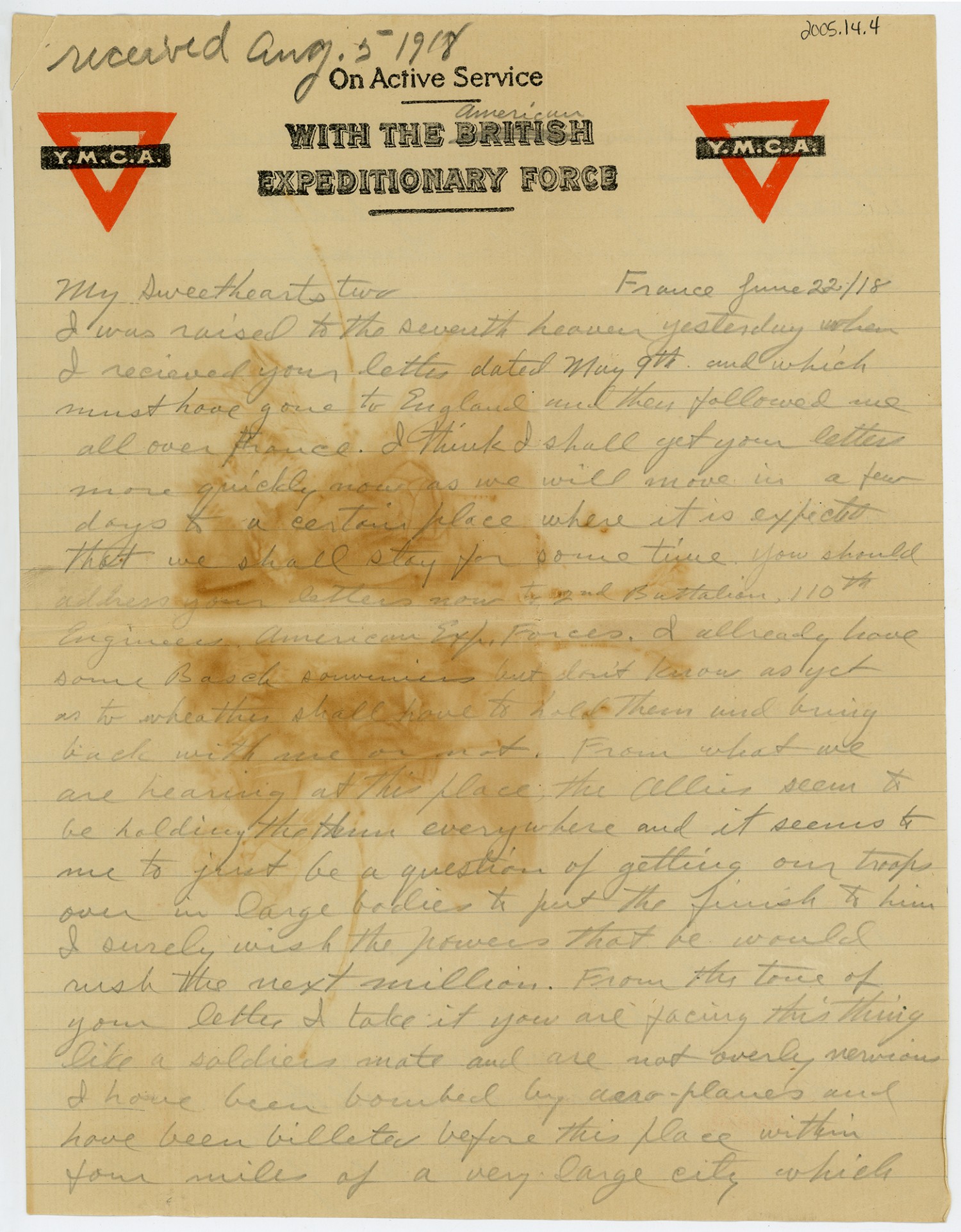 [Y.M.C.A. letterhead] France June 22 [1918] My Sweethearts two I was raised to the seventh heaven yesterday when I received your letter dated May 9th and which must have gone to England and then followed me all over France. I think I shall get your letters more quickly now as we will move in a few days to a certain place where it is expected that we shall stay for some time. You should address your letters now to 2nd Battalion, 110th Engineers, American Exp. Forces. I already have some Bosch souveniers but don