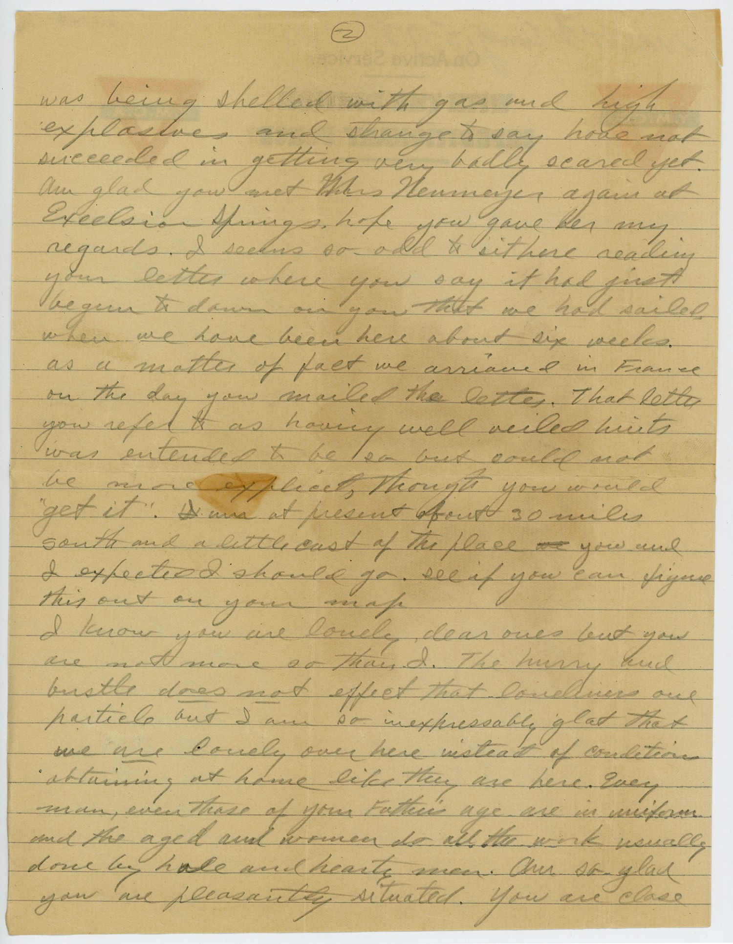 [page 2] was being shelled with gas and high explosives and strange to say have not succeeded in getting very badly scared yet. Am glad you met Mrs Newmeyer again at Excelsior Springs, hope you gave her my regards. I seems so odd to sit here reading your letter where you say it had just begun to dawn on you that we had sailed, when we have been here about six weeks. As a matter of fact we arrived in France on the day you mailed the letter. That letter you refer to as having well veiled hints was entended to be so but could not be more explicit, though you would