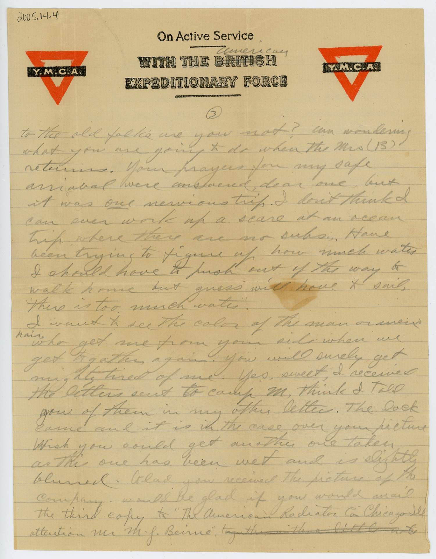 [Y.M.C.A. letterhead] [page 3] to the old folks are you not? Am wondering what you are going to do when the Mrs (B) returns. Your prayers for my safe arrival were answered, dear one, but it was one nervious trip. I don