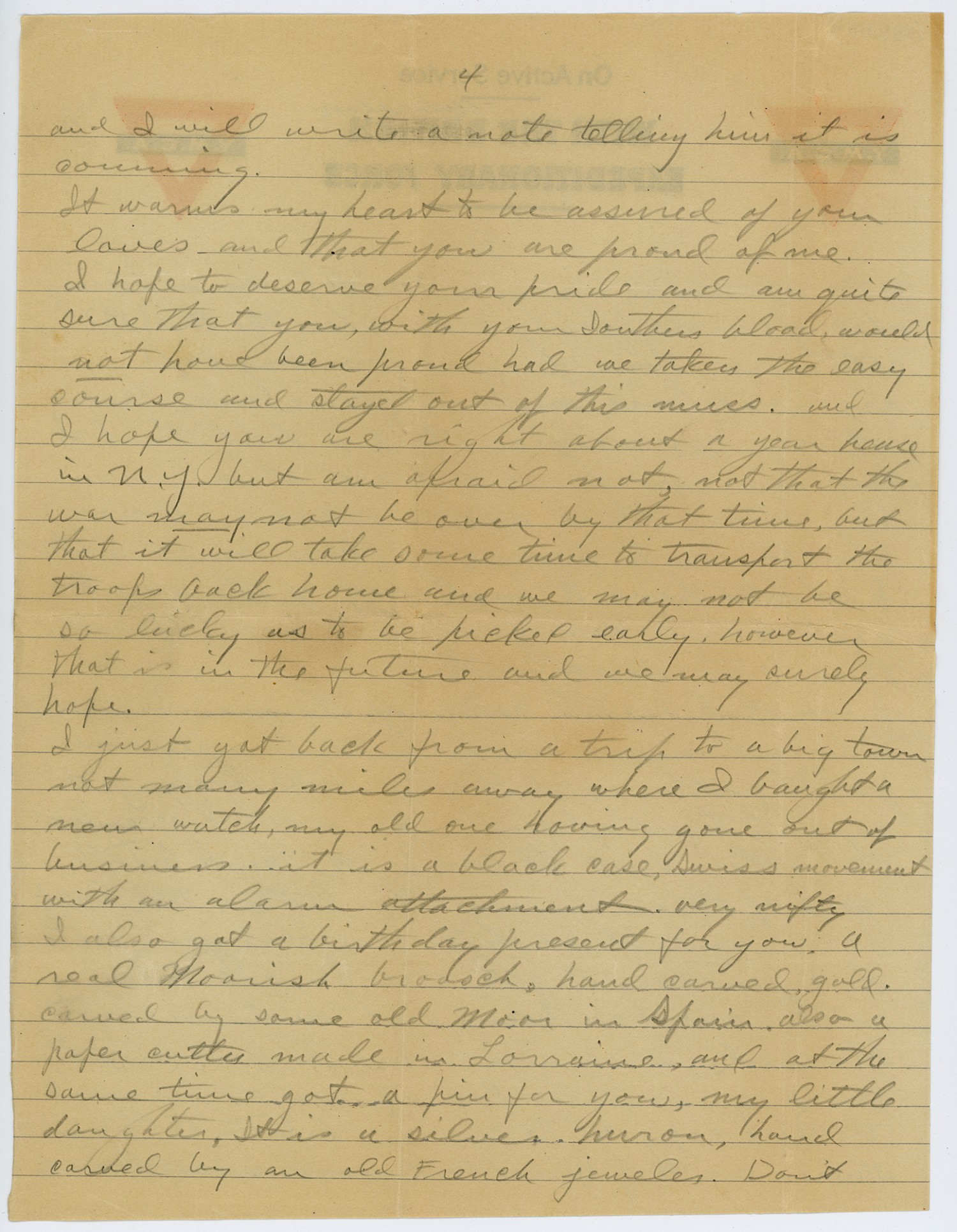 [page 4] and I will write a note telling him it is coming. It warms my heart to be assured of your loves and that you are proud of me. I hope to deserve your pride and am quite sure that you, with your Southern blood, would not have been proud had we taken the easy course and stayed out of this mess. and I hope you are right about a year house in [New York] but am afraid not, not that the war may not be over by that time, but that it will take some time to transport the troops back home and we may not be so lucky as to be picked early. however that is in the future and we may surely hope. I just got back from a trip to a big town not many miles away where I bought a new watch, my old one having gone out of business, it is a black case, Swiss movement with an alarm attachment, very nifty I also got a birthday present for you. A real Moorish brooch, hand carved gold. carved by some old Moor in Spain. also a paper cutter made in Lorraine, and at the same time got a pin for you, my little daughter. It is a silver huron, hand carved by an old French jeweler. Don