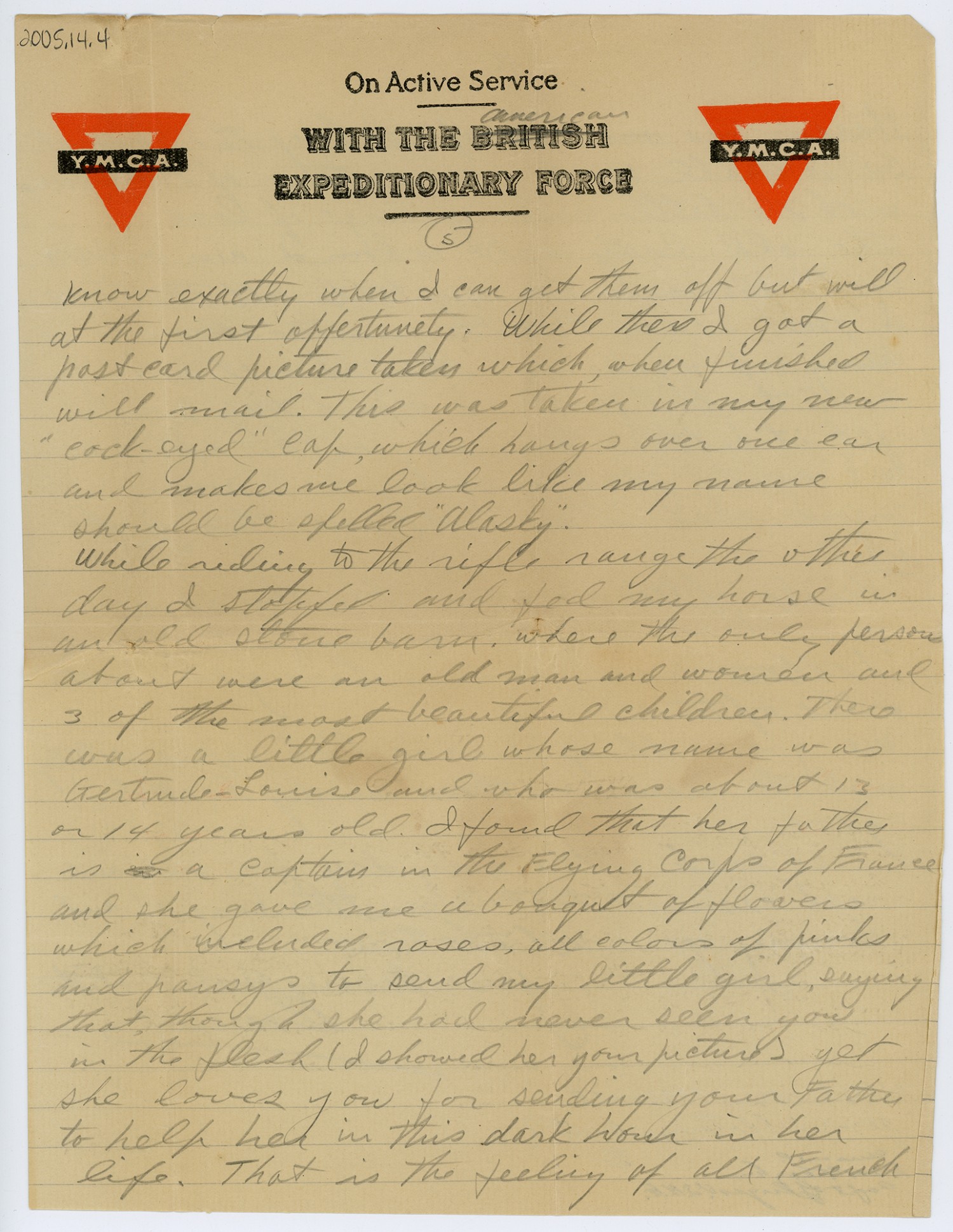[Y.M.C.A. letterhead] [page 5] know exactly when I can get them off but will at the first oppertunety. While there I got a post card picture taken which, when finished will mail. This was taken in my new