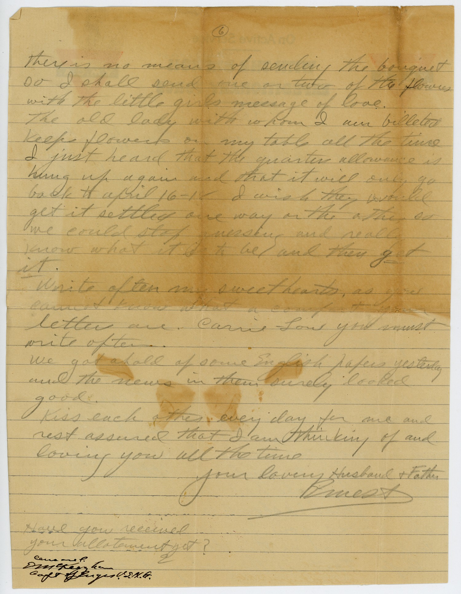 [page 6] there is no means of sending the bouquet so I shall send one or two of the flowers with the little girls message of love. The old lady with whom I am billeted keeps flowers on my table all the time I just heard that the quarters allowance is hung up again and that it will only go back to April 16-18 I wish they would get it settled one way or the other, so we could stop guessing and really know what it is to be and then get it. Write often my sweethearts, as you cannot know what a comfort your letters are. Carrie-Lou you must write often. We got ahold of some English papers yesterday and the news in them surely looked good. Kiss each other every day for me and rest assured that I am thinking of an loving you all the time Your loving Husband & Father Ernest Have you received your allotement yet? E Censored EMcKeighan Capt of Enges U.S.N.G.