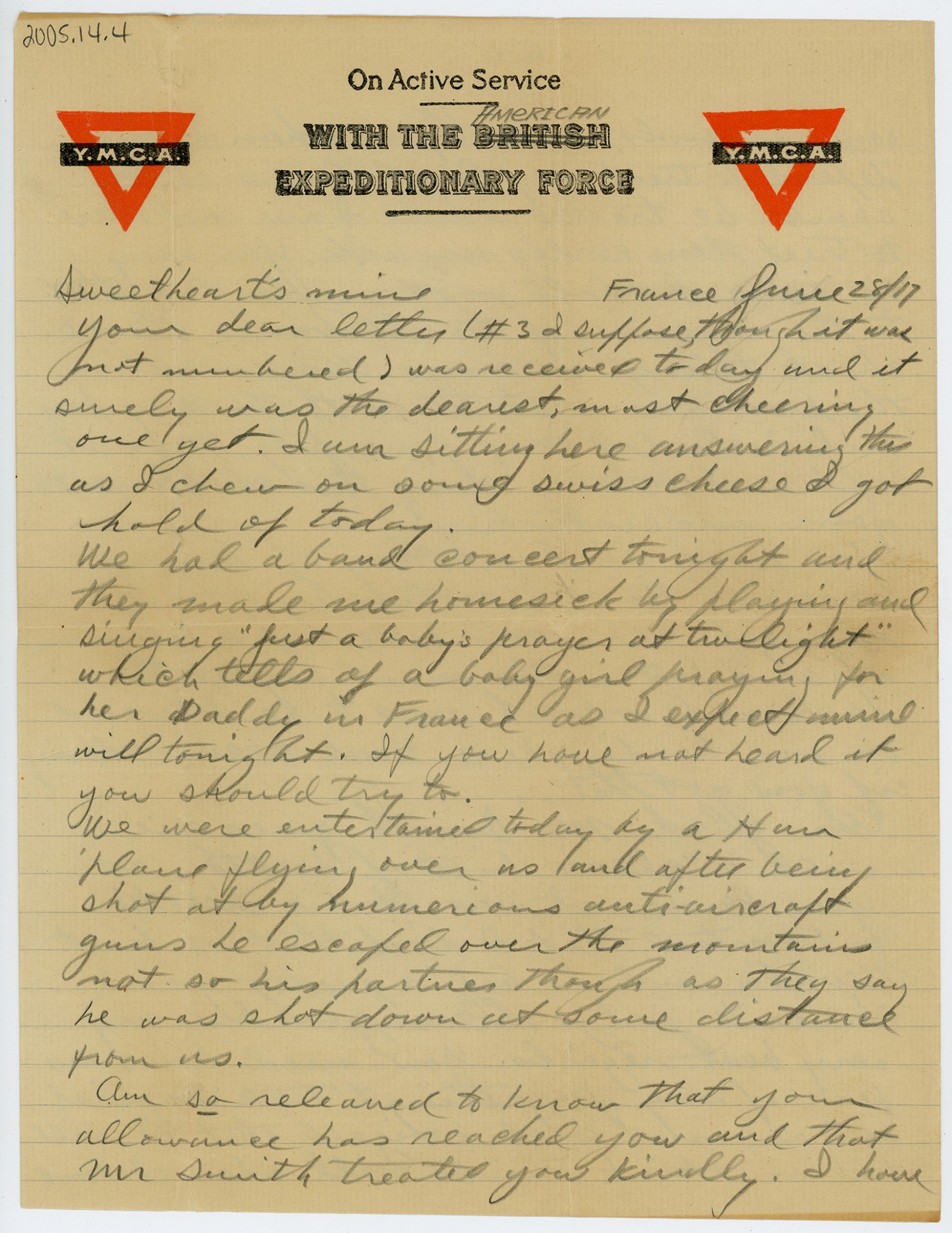 [Y.M.C.A. letterhead] France June 28, [1917] Sweetheart