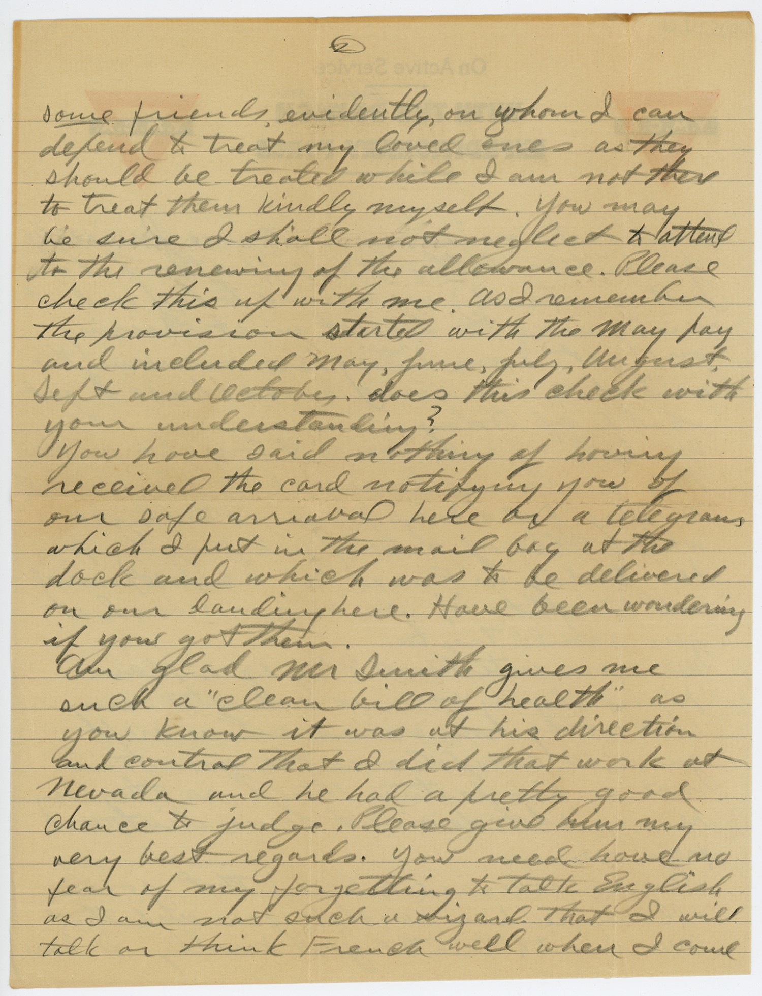 [page 2] some friends, evidently, on whom I can depend to treat my loved ones as they should be treated while I am not there to treat them kindly myself. You may be sure I shall not neglect to attend to the renewing of the allowance. Please check this up with me. As I remember the provision started with the May pay and included May, June, July, August, [September] and October, does this check with your understanding? You have said nothing of having received the card notifying you of our safe arrival here or a telegram which I put in the mail bag at the dock and which was to be delivered on our landing here. Have been wondering if you got them. Am glad Mr Smith gives me such a