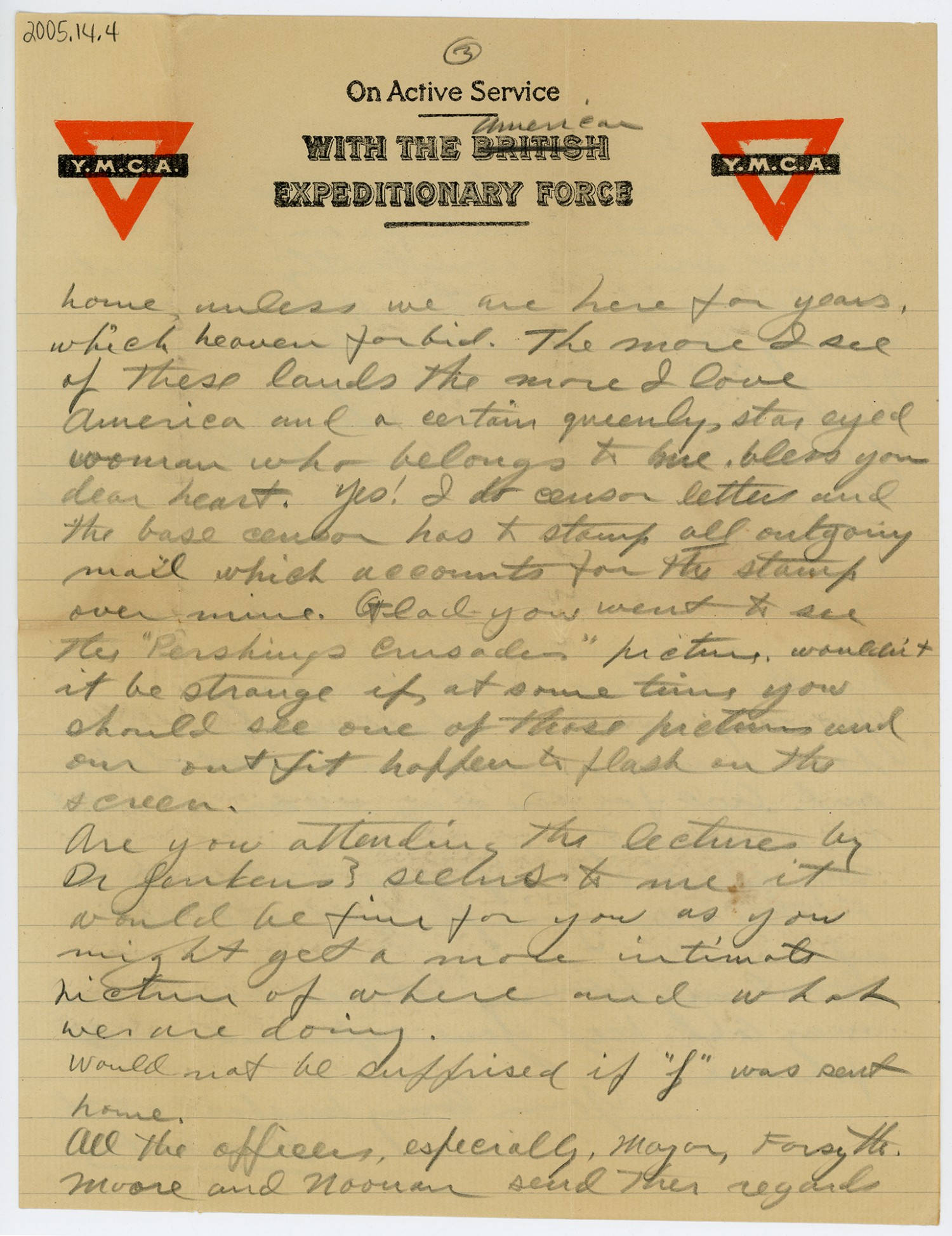 [Y.M.C.A. letterhead] [page 3] home, unless we are here for years, which heaven forbid. The more I see of these lands the more I love America and a certain queenly star eyed woman who belongs to me. bless you dear heart. Yes! I do censor letters and the base censor has to stamp all outgoing mail which accounts for the stamp over mine. Glad you went to see the