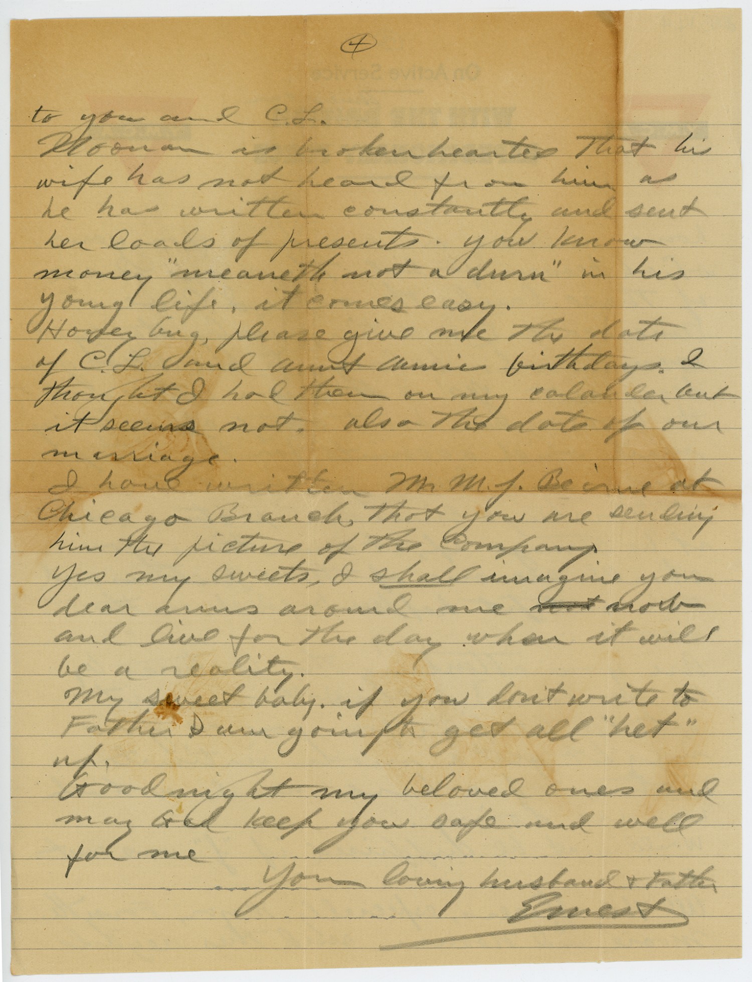 [page 4] to you and C.L. Nooman is broken hearted that his wife has not heard from him as he has written constantly and sent her loads of presents. You know money