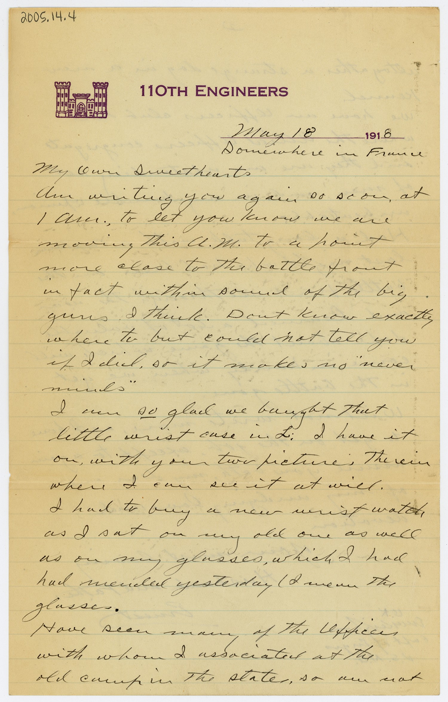 [110th Engineers letterhead] May 18 1918 Somewhere in France My own Sweethearts Am writing you again so soon, at 1 AM, to let you know we are moving this A.M. to a point more close to the battle front in fact within sound of the big guns I think. Don
