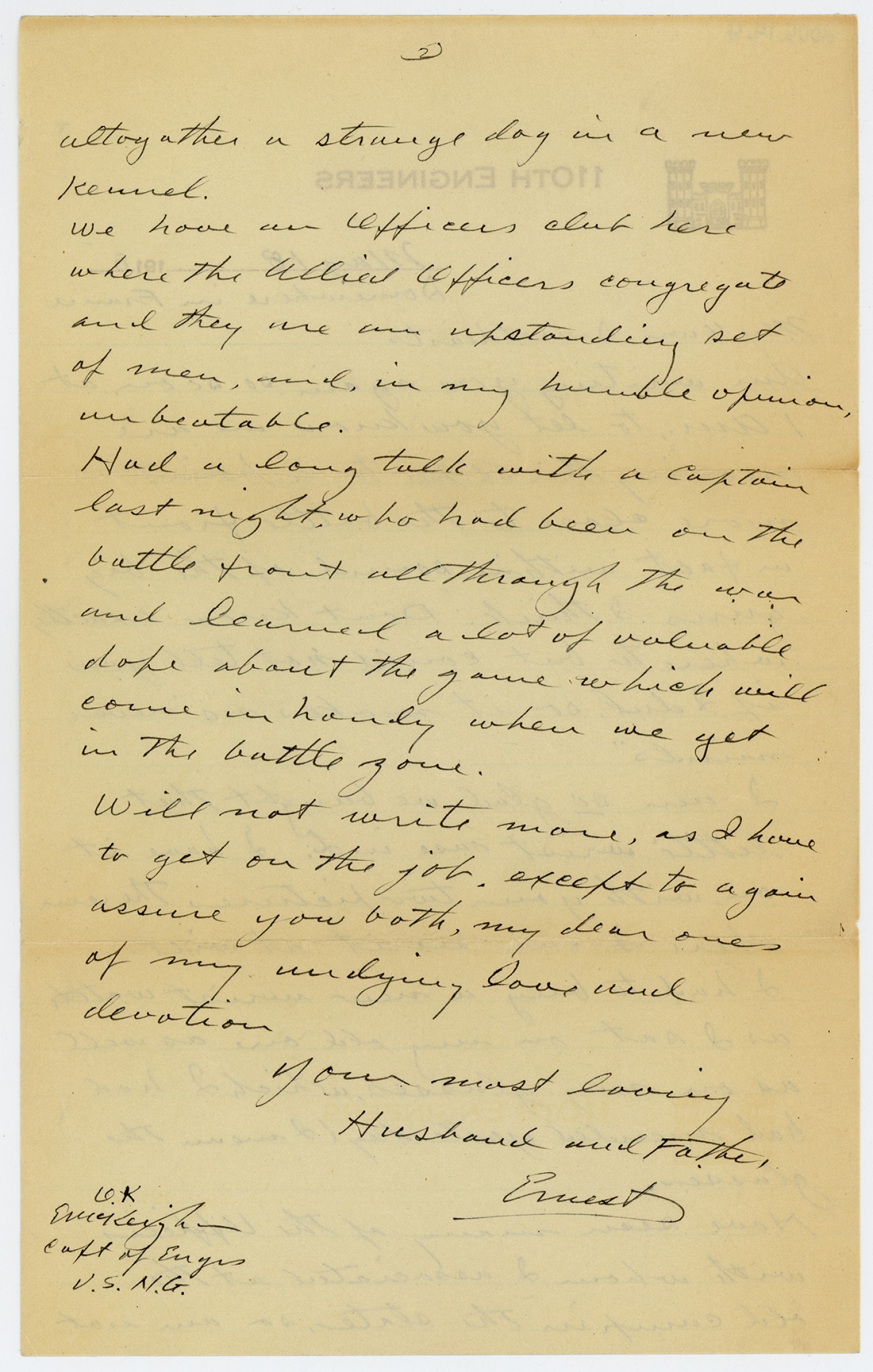 [page 2] altogether a strange dog in a new kennel. We have Officers club here where the Allied Officers congregate and they are an upstanding set of men, and, in my humble opinion, unbeatable. Had a long talk with a Captain last night, who had been on the battle front all through the war and learned a lot of valuable dope about the game which will come in handy when we get in the battle zone. Will not write more, as I have to get on the job, except to again assure you both, my dear one of my undying love and devotion Your most loving Husband and Father Ernest O.K EMcKeighan Capt of Engrs U.S.N.G.