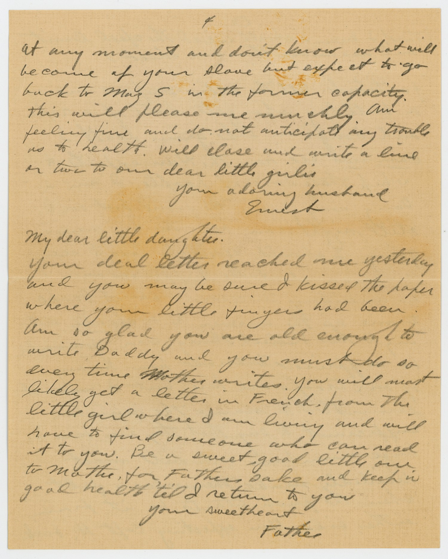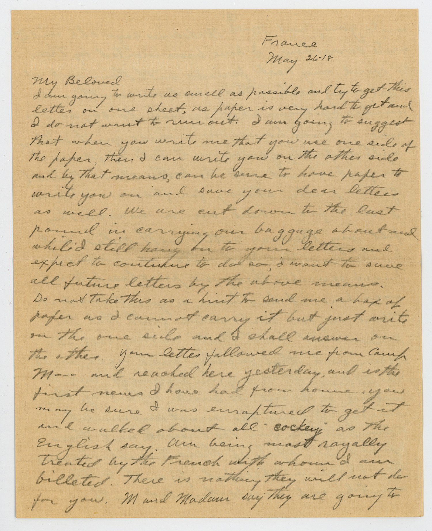 France May 26 [1918] My Beloved I am going to write as small as possible and try to get this letter on one sheet, as paper is very hard to get and I do not want to run out. I am going to suggest that when you write me that you use one side of the paper, then I can write you on the other side and by that means, can be sure to have paper to write you on and save your dear letters as well. We are cut down to the last pound in carrying our baggage about and while I still hang on to your letters and expect to continue to do so, I want to save all future letters by the above means. Do not take this as a hint to send me a box of paper as I cannot carry it but just write on the one side and I shall answer on the other. Your letter followed me from Camp M--- and reached here yesterday, and is the first news I have had from home. you may be sure I was enraptured to get it and walked about all