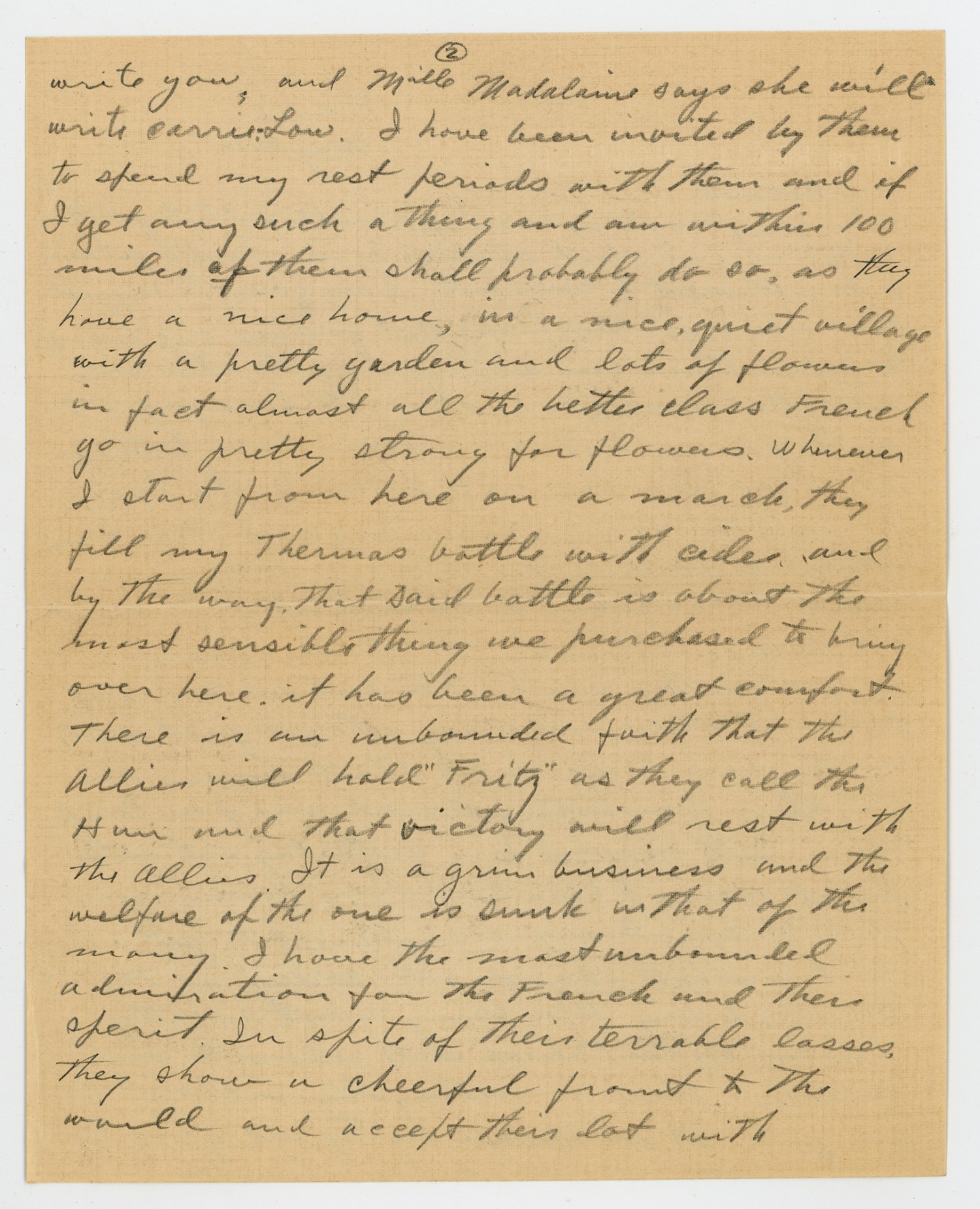 [page 2] write you and Mille Madalaine says she will write Carrie-Lou. I have been invited by them to spend my rest periods with them and if I get any such a thing and am within 100 miles of them shall probably do so, as they have a nice home, in a nice, quiet village with a pretty garden and lots of flowers in fact almost all the better class French go in pretty strong for flowers. Whenever I start from here on a march, they fill my Thermos bottle with cider, and by the way, that said bottle is about the most sensible thing we purchased to bring over here, it has been a great comfort. There is an unbounded faith that the Allies will hold