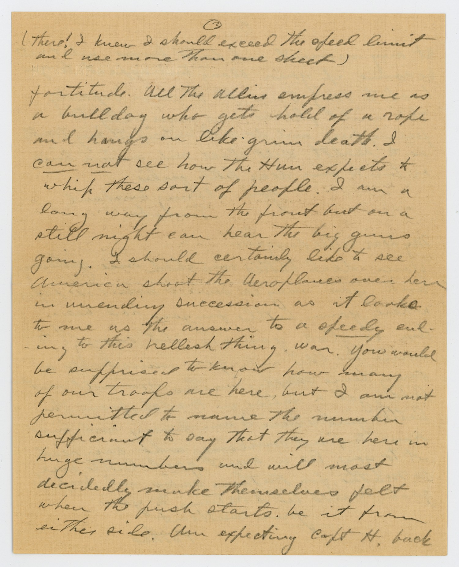 [page 3] (there! I knew I should exceed the speed limit and use more than one sheet) fortitude. All the Allies empress me as a bull dog who gets hold of a rope and hangs on like grim death. I can not see how the Hun expects to whip these sort of people. I am a long way from the front but on a still night can hear the big guns going. I should certainly like to see America shoot the Aeroplanes over here in unending succession as it looks to me as the answer to a speedy ending to this hellish thing, war. You would be supprised to know how many of our troops are here, but I am not permitted to name the number sufficient to say that they are here in huge numbers and will most decidedly make themselves felt when the push starts. be it from either side. Am expecting Capt H. back