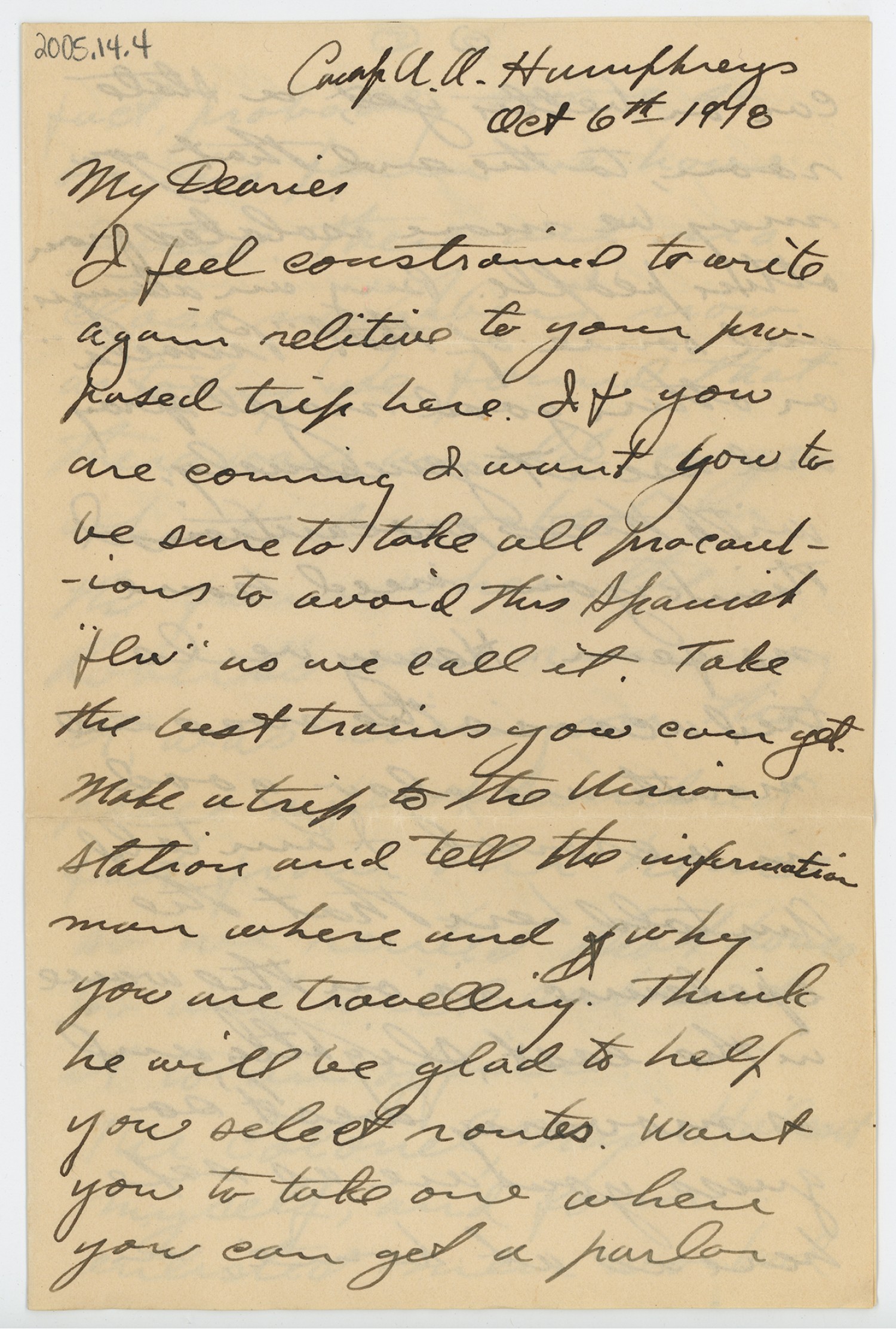 Camp A.A. Humphreys [October] 6th 1918 My Dearies I feel constrained to write again relative to your proposed trip here. If you are coming I want you to be sure to take all precautions to avoid this Spanish