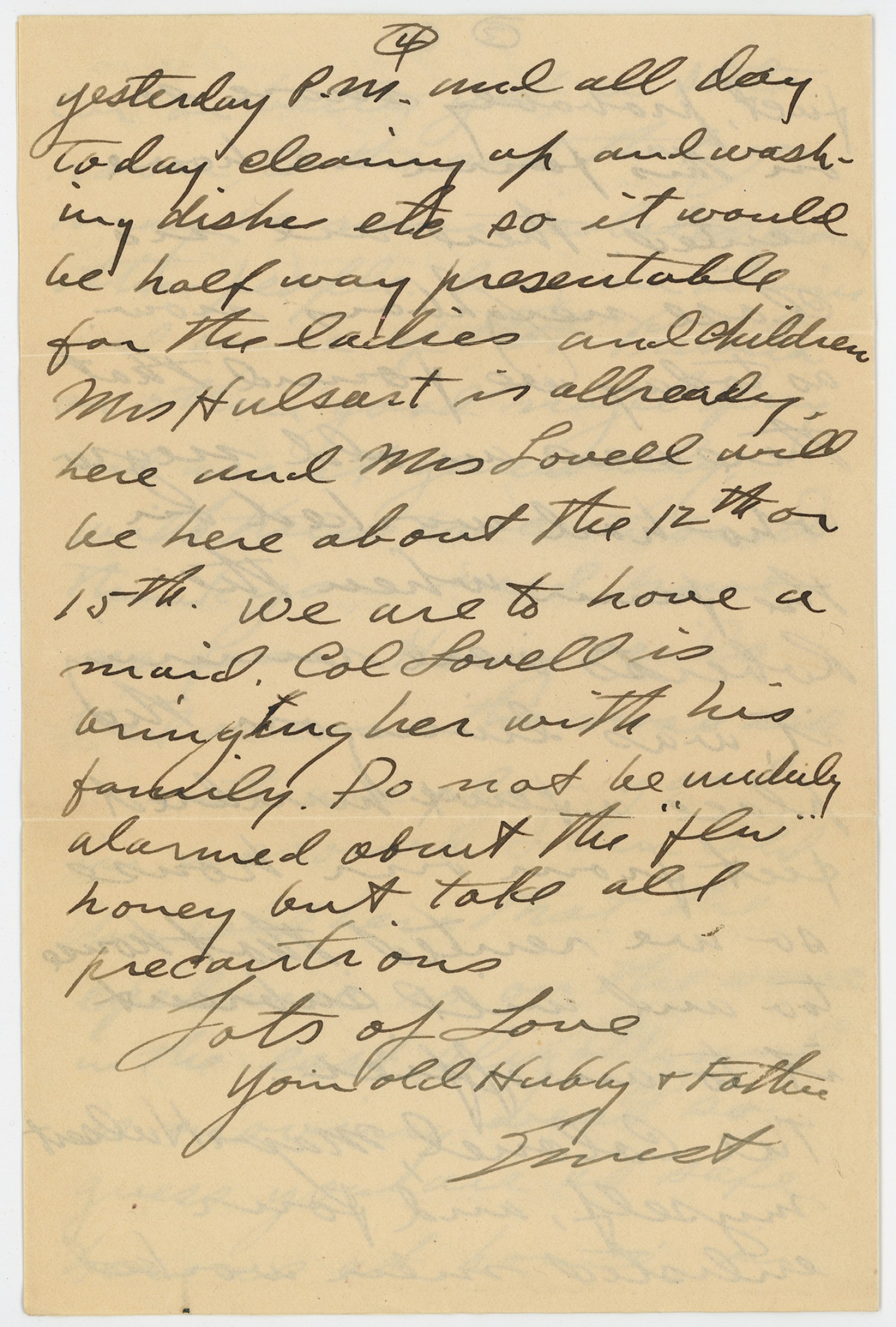 [page 4] yesterday P.M. and all day today cleaning up and washing dishes etc so it would be half way presentable for the ladies and children Mrs Hulsart is already here and Mrs Lovell will be here about the 12th or 15th. We are to have a maid. Col Lovell is bringing her with his family. Do not be unduly alarmed about the