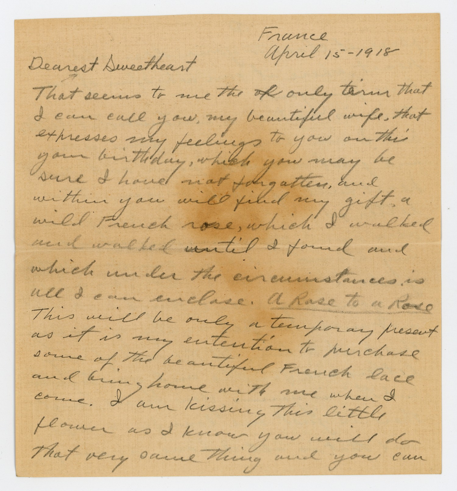 France April 15 - 1918 Dearest Sweetheart That seems to me the only term that I can call you, my beautiful wife, that expresses my feelings to you on this your birthday, which you may be sure I have not forgotten, and within you will find my gift a wild French rose, which I walked and walked until I found and which under the circumstances is all I can enclose. A Rose to a Rose This will be only a temporary present as it is my entention to purchase some of the beautiful French lace and bring home with me when I come. I am kissing this little flower as I know you will do that very same thing and you can