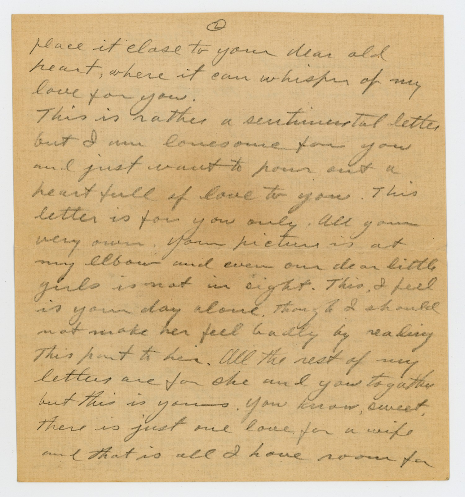 [page 2] place it close to you dear old heart, where it can whisper of my love for you. This is rather a sentimental letter but I am lonesome for you and just want to pour out a heart full of love to you. This letter is for you only. All your very own. Your picture is at my elbow and even our dear little girls is not in sight. This, I feel is your day alone. Though I should not make her feel badly by reading this part to her. All the rest of my letters are for she and you together but this is yours. You know, sweet, there is just one love for a wife and that is all I have room for