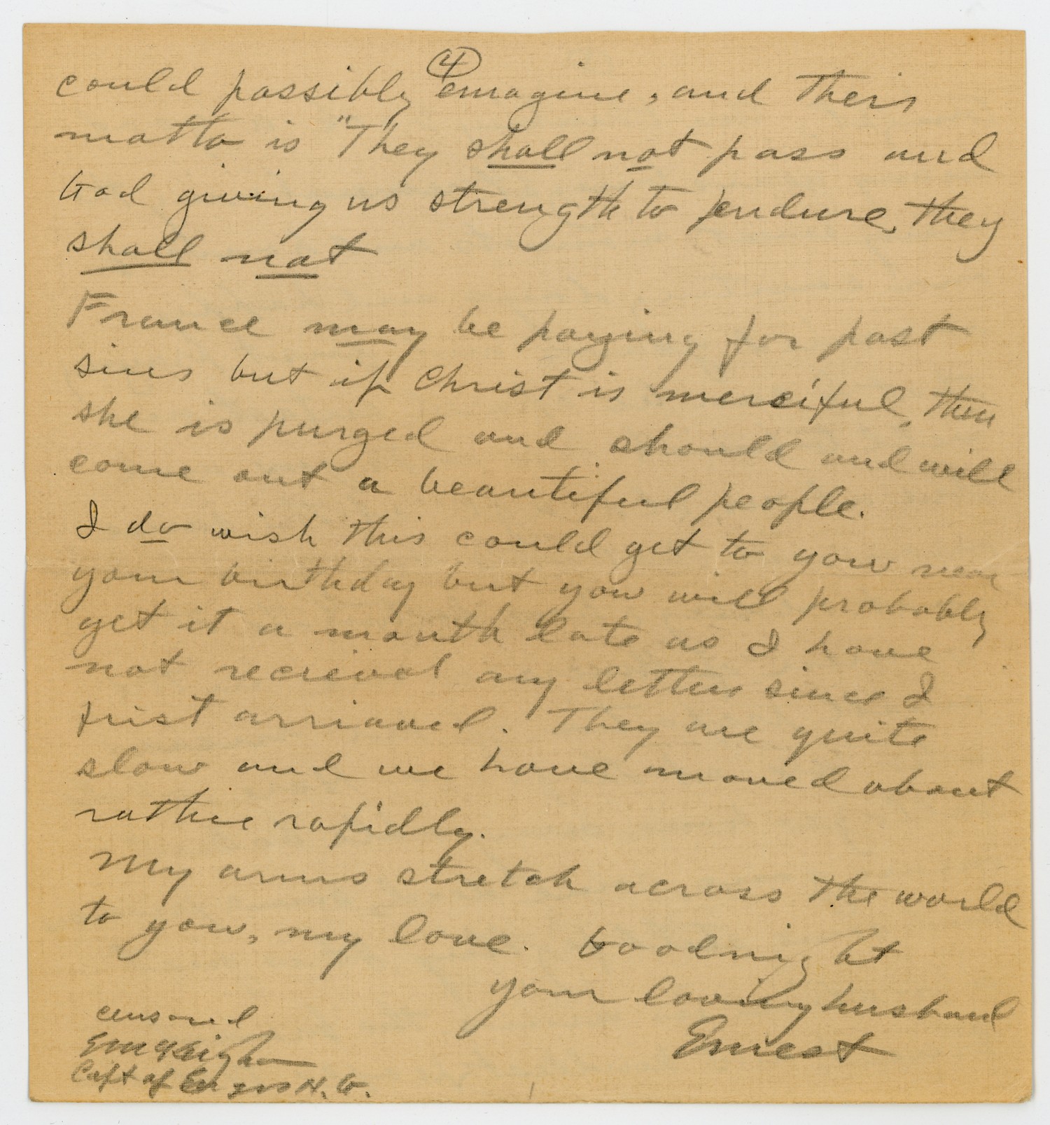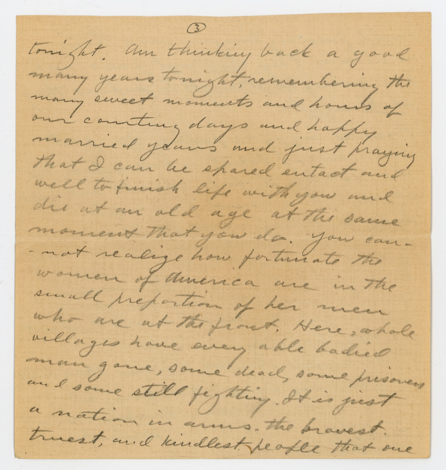 [page 3] tonight. Am thinking back a good many years tonight remembering the many sweet moments and hours of our courting days and happy married years and just praying that I can be spared entact and well to finish life with you and die at an old age at the same moment that you do. You cannot realize how fortunate the women of America are in the small proportion of her men who are at the front. Here, whole villages have every able bodief man gone, some dead, some prisoners and some still fighting. It is just a nation in arms, the bravest, truest, and kindlest people that one