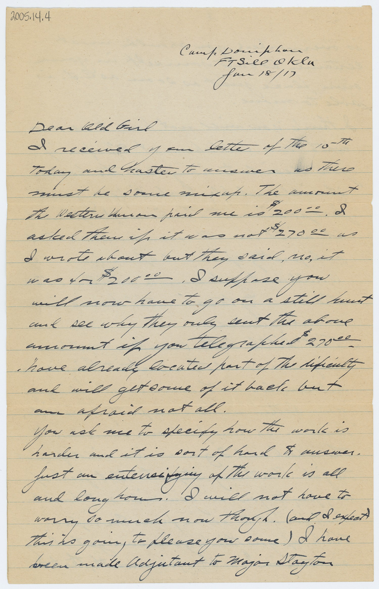 Camp Doniphan [Fort Sill, Oklahoma] [January 18, 1917] Dear Old Girl I received your letter of the 15th today and hasten to answer as there must be some mix up. The amount the Western Union paid me is $200.00 I asked them if it was not $270.00 as I wrote about but they said, no, it was for $200.00. I suppose you will now have to go on a still hunt and see why they only sent the above amount if you telegraphed $270.00. have already located part of the dificulty and will get some of it back but am afraid not all. You ask me to specify how the work is harder and it is sort of hard to answer. Just an entensifying of the work is all and long hours. I will not have to worry so much though. (and I expect this is going to please you some) I have been made Adjutant to Major Stayton