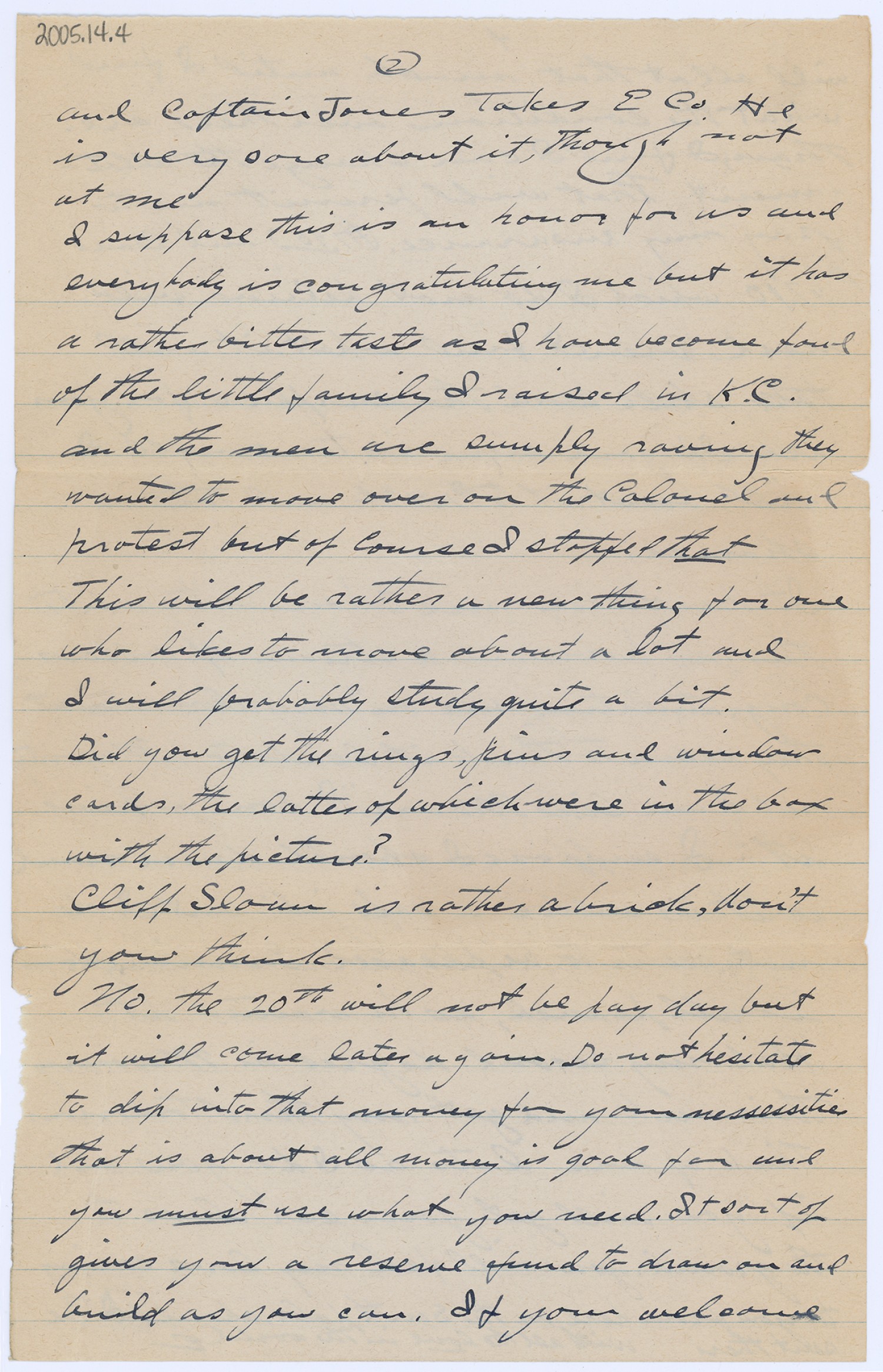 [page 2] and Captain James takes E Co. He is very sore about it, though not at me I suppose this is an honor for us and everybody is congratulating me but it has a rather bitter taste as I have become fond of the little family I raised in [Kansas City] and the men are simply raving they wanted to move over on the Colonel and protest but of Course I stopped that This will be rather a new thing for one who likes to move about a lot and I will probably study quite a bit. Did you get the rings, pins and window cards, the latter of which were in the box with the picture? Cliff Sloun is rather a brick, don