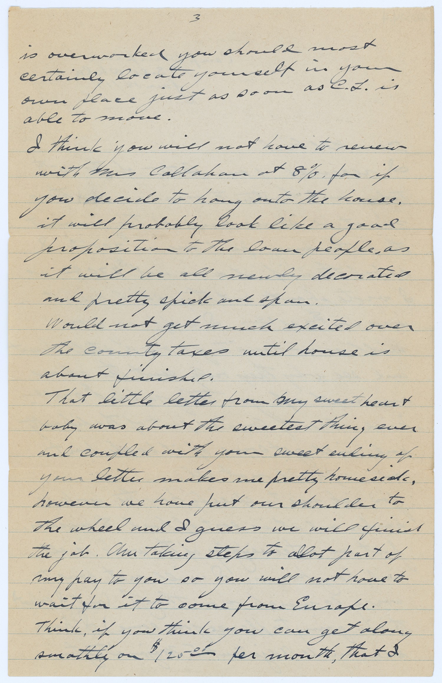 [page 3] is overworked you should most certainly locate yourself in your own place just as soon as C.L. is able to move. I think you will not have to renew with Mrs Callahan at 8%, for if you decide to hang onto the house, it will probably look like a good proposition to the loan people, as it will be all newly decorated and pretty spick and span. Would not get much excited over the county taxes until house is about finished. That little letter from my sweet heart baby was about the sweetest thing ever and coupled with your sweet ending of your letter makes me pretty homesick, however we have put our shoulder to the wheel and I guess we will finish the job. Am taking steps to allot part of my pay to you so you will not have to wait for it to come from Europe. Think, if you think you can get along smoothly on $125.00 per month, that I