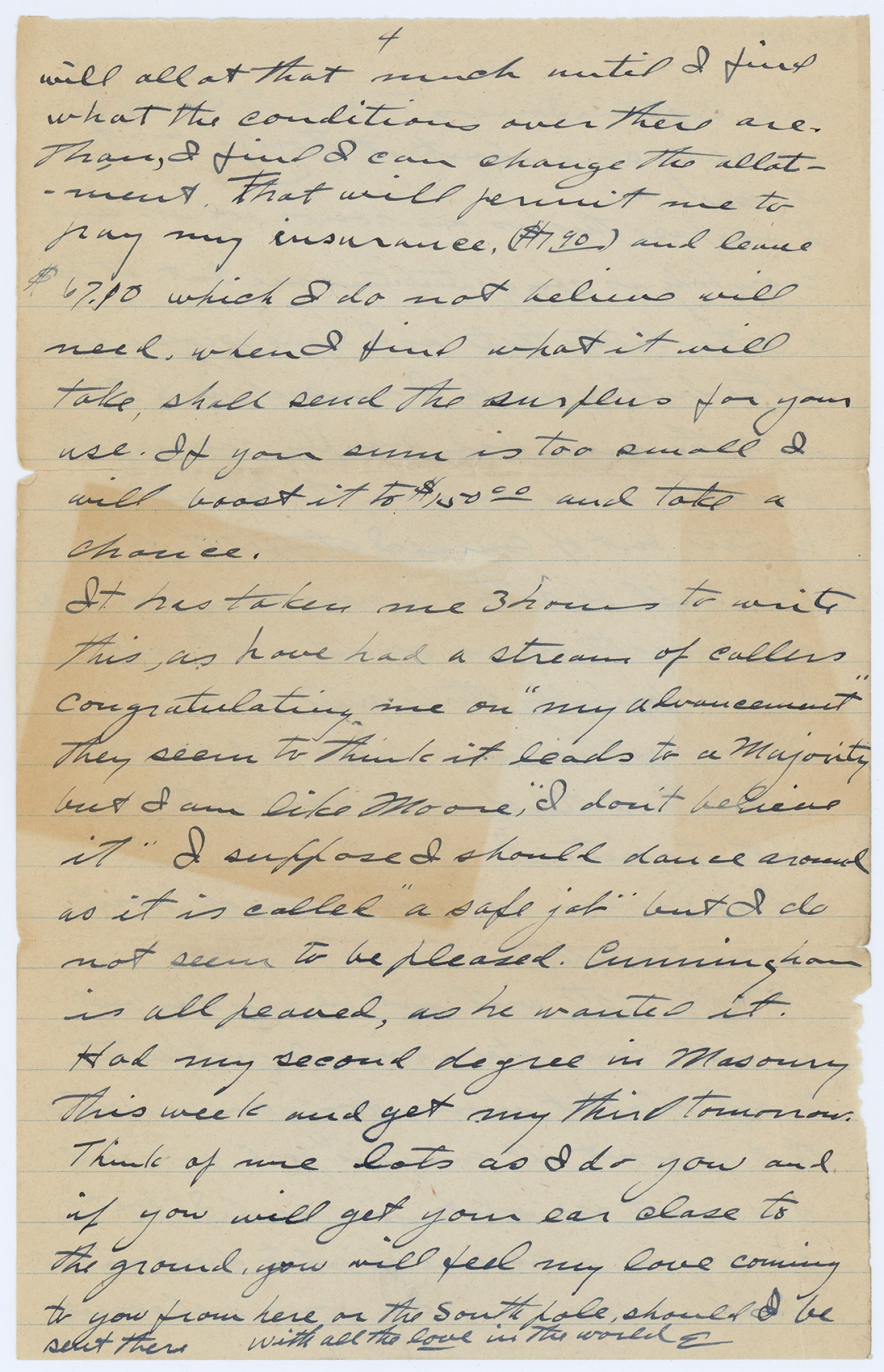 [page 4] will allot that much until I find what the conditions over there are. Than, I find I can change the allotment. That will permit me to pay my insurance, ($7.90) and leave $67.10 which I do not believe will need, when I find what it will take, shall send the surplus for your use. If your sum is too small I will boost it to $150.00 and take a chance. It has taken me 3 hours to write this, as have had a stream of callers congratulating me on