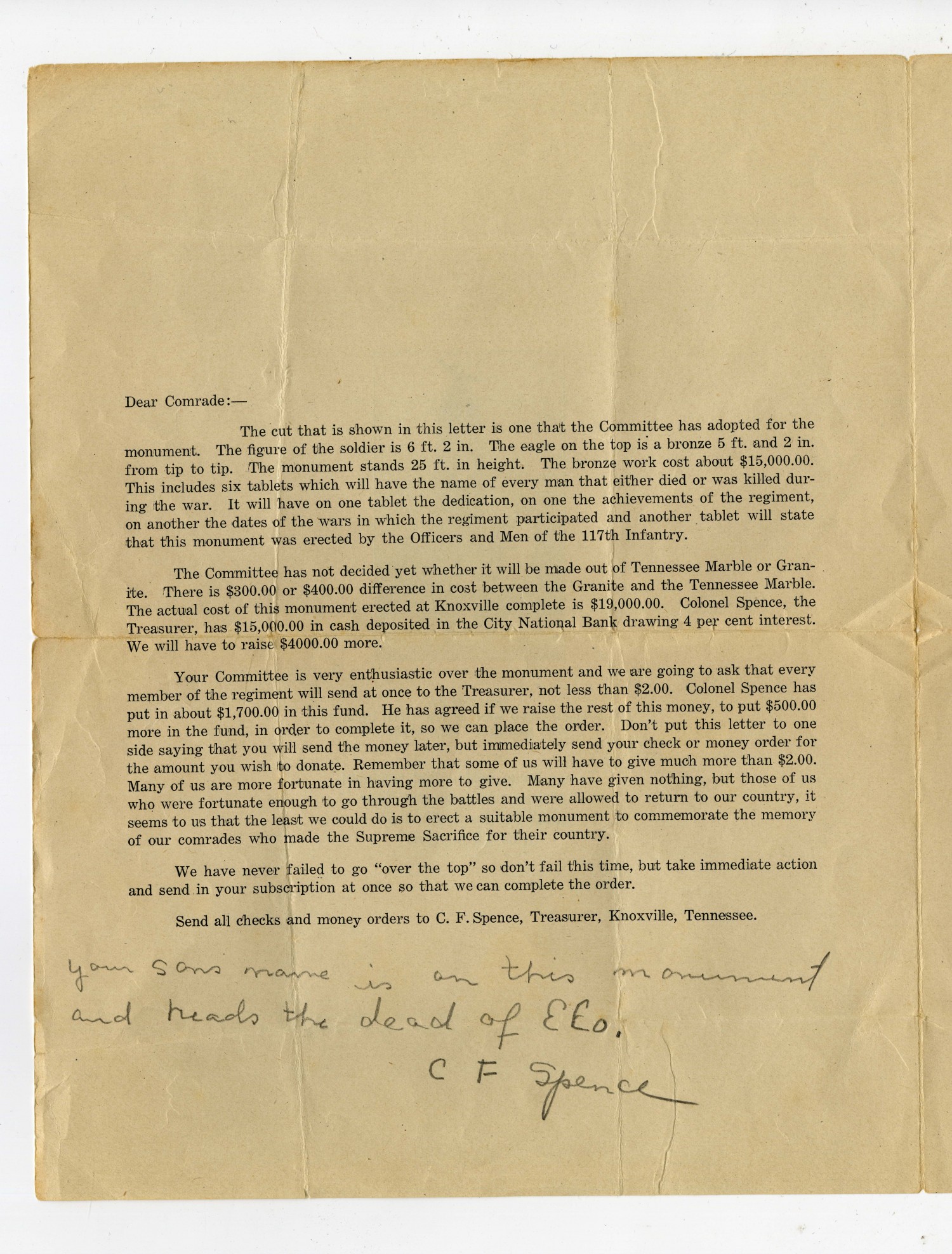| Description | A document detailing a fundraiser to build a monument for WWI veterans. |
