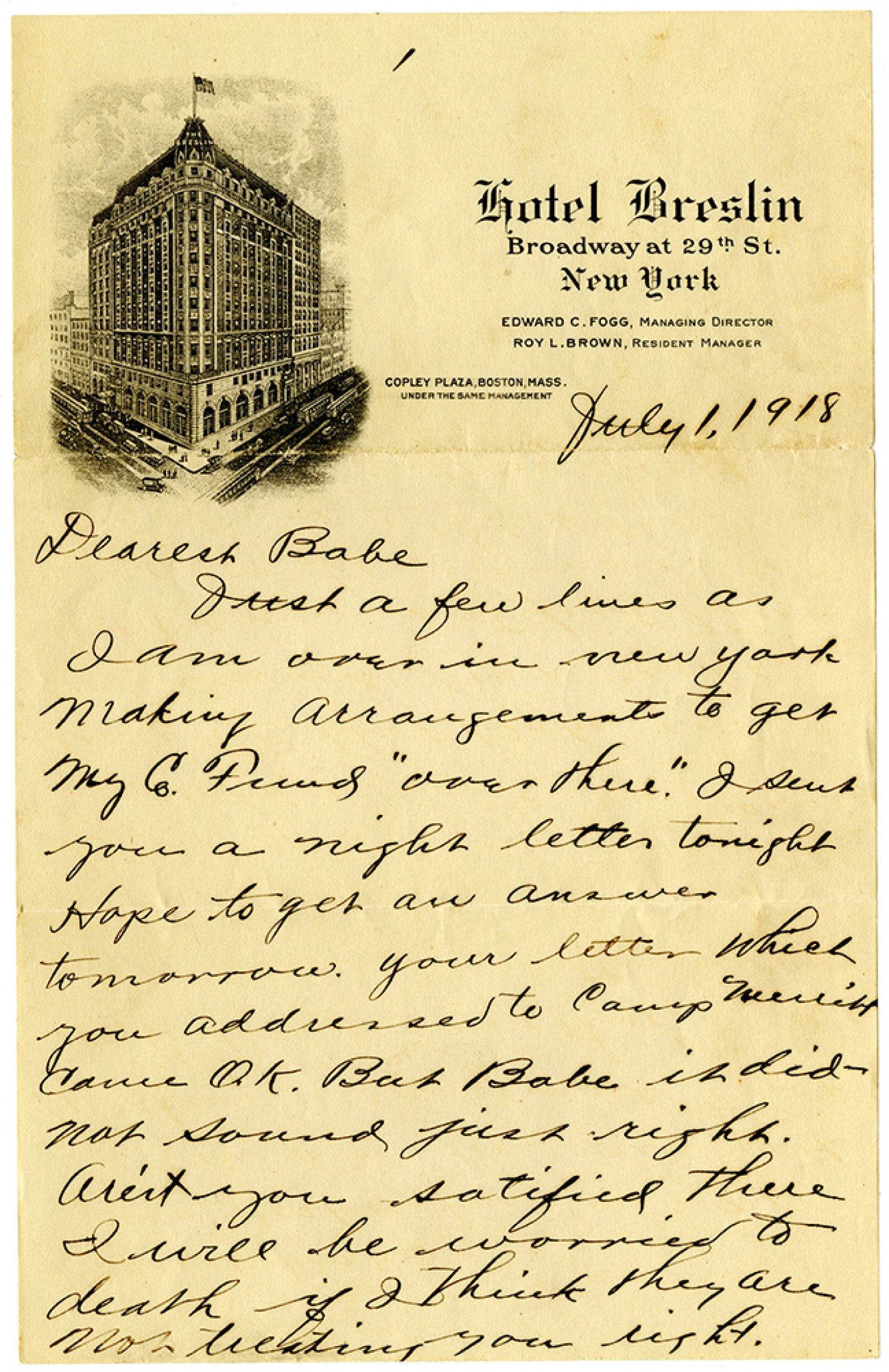 [page 1] July 1, 1918 Dearest Babe Just a few lines as I am over in New York making arrangements to get my Co. Fund “over there”. I sent you a night letter tonight Hope to get an answer tomorrow. your letter which you addressed to Camp Merritt came O.K. But Babe it did not sound just right. Aren't you satified there I will be worried to death if I think they are not treating you right.
