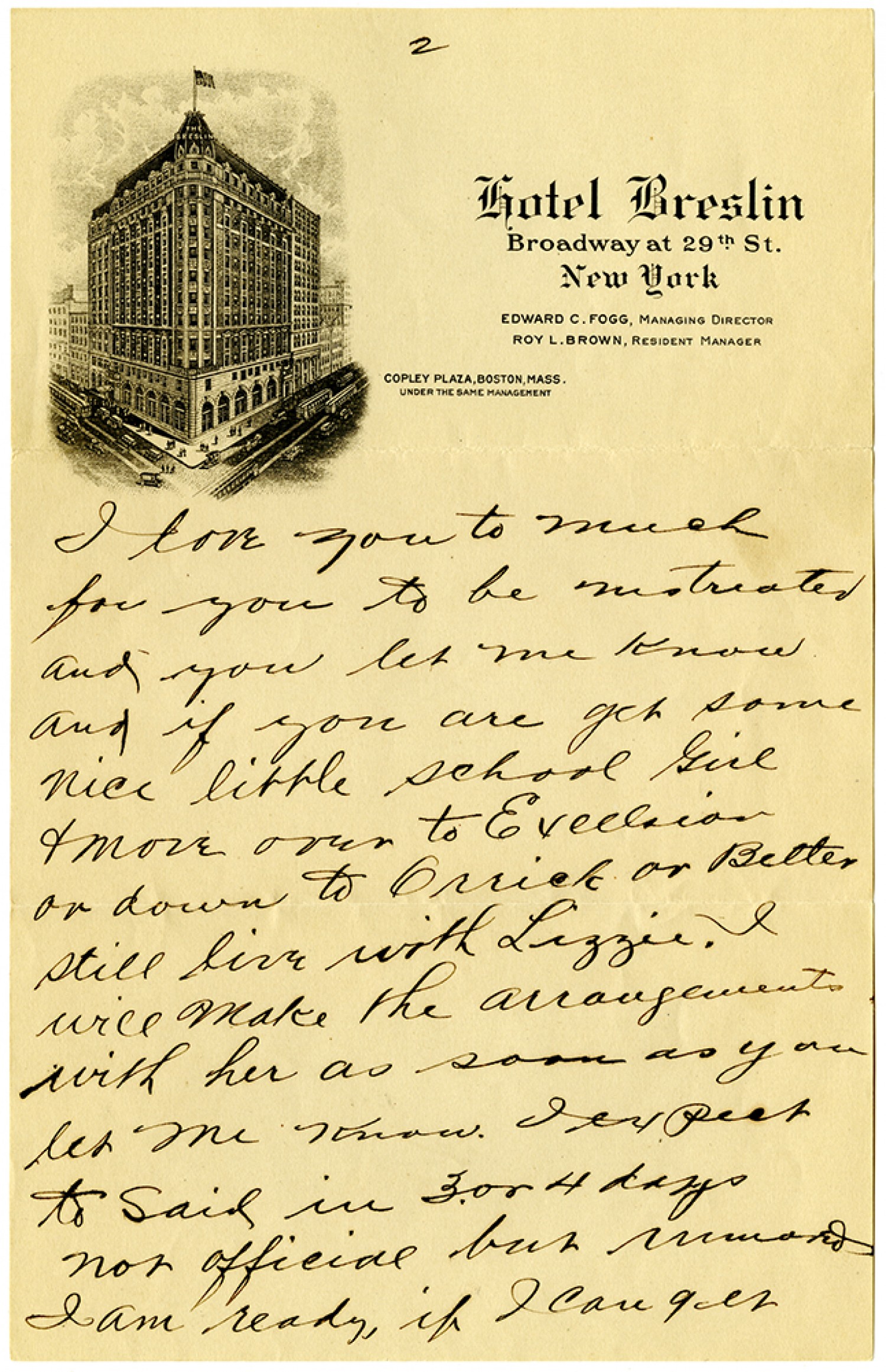 [page 2] I love you to much for you to be mistreated and you let me know and if you are get some nice little school Girl & move over to Excelsior or down to Orrick or Better still live with Lizzie. I will make the arrangements with her as soon as you let me know. I expect to sail in 3 or 4 days not official but rumored I am ready, if I can get