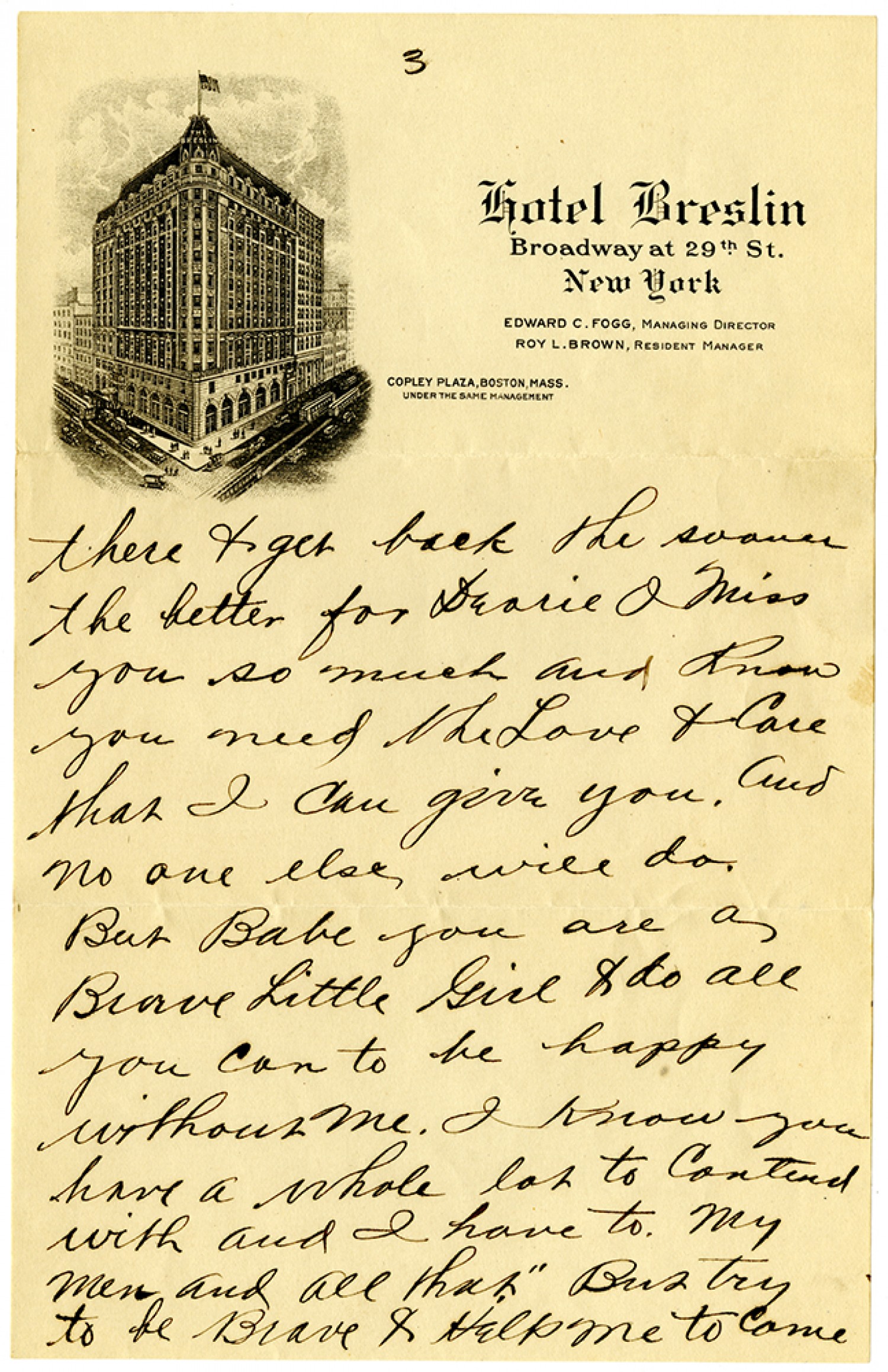[page 3] there & get back there sooner the better for Dearie I miss you so much and know you need the Love & Care that I can give you. And no one else will do. But Babe you are a Brave Little Girl & do all you can to be happy without me. I know you have a whole lot to contend with and I have to. My men and all that. But try to be Brave & Help me to come