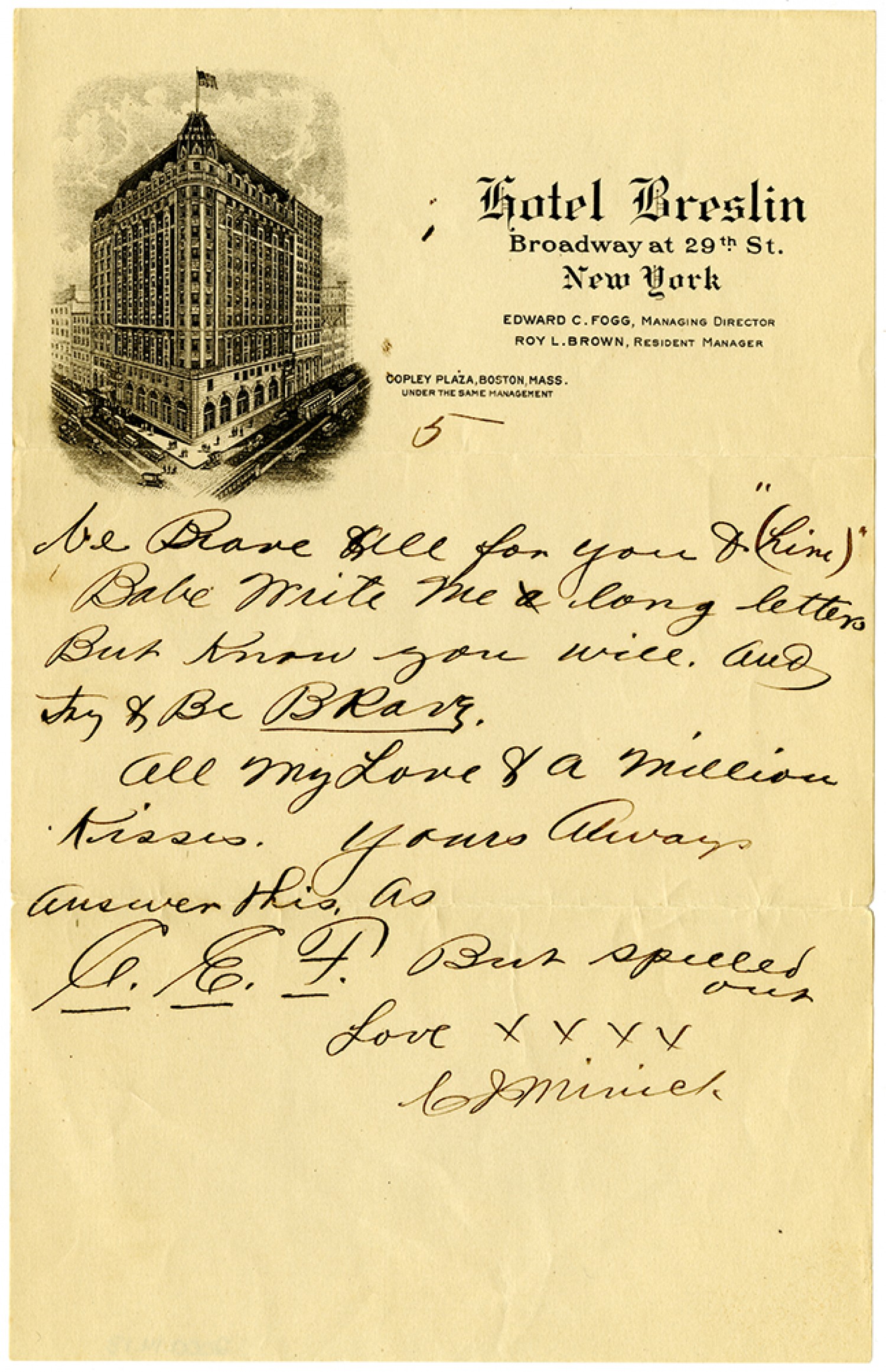 [page 5] be Brave all for you & "(him)" Babe write me long letters But know you will. And try to Be Brave. All my Love & a million kisses. Yours Always Answer this as C.E.F. But spelled out Love xxxx CJ Minick