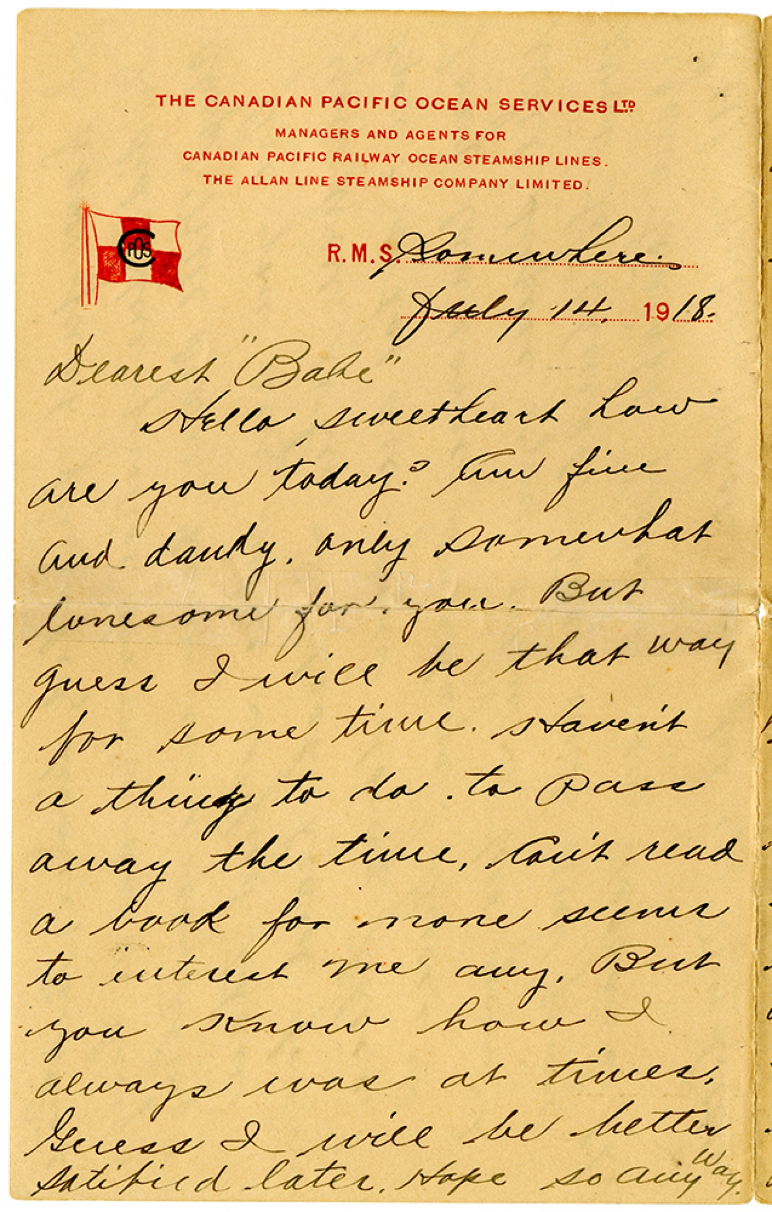 Somewhere July 14, 1918 Dearest "Babe" Hello sweetheart how are you today? Am fine and dandy only somewhat lonesome for you. But guess I will be that way for some time. Haven't a thing to do to pass away the time, and read a book for none seems to interest me any. But you know how I always was a times. Guess I will be better satified later. Hope so any way.