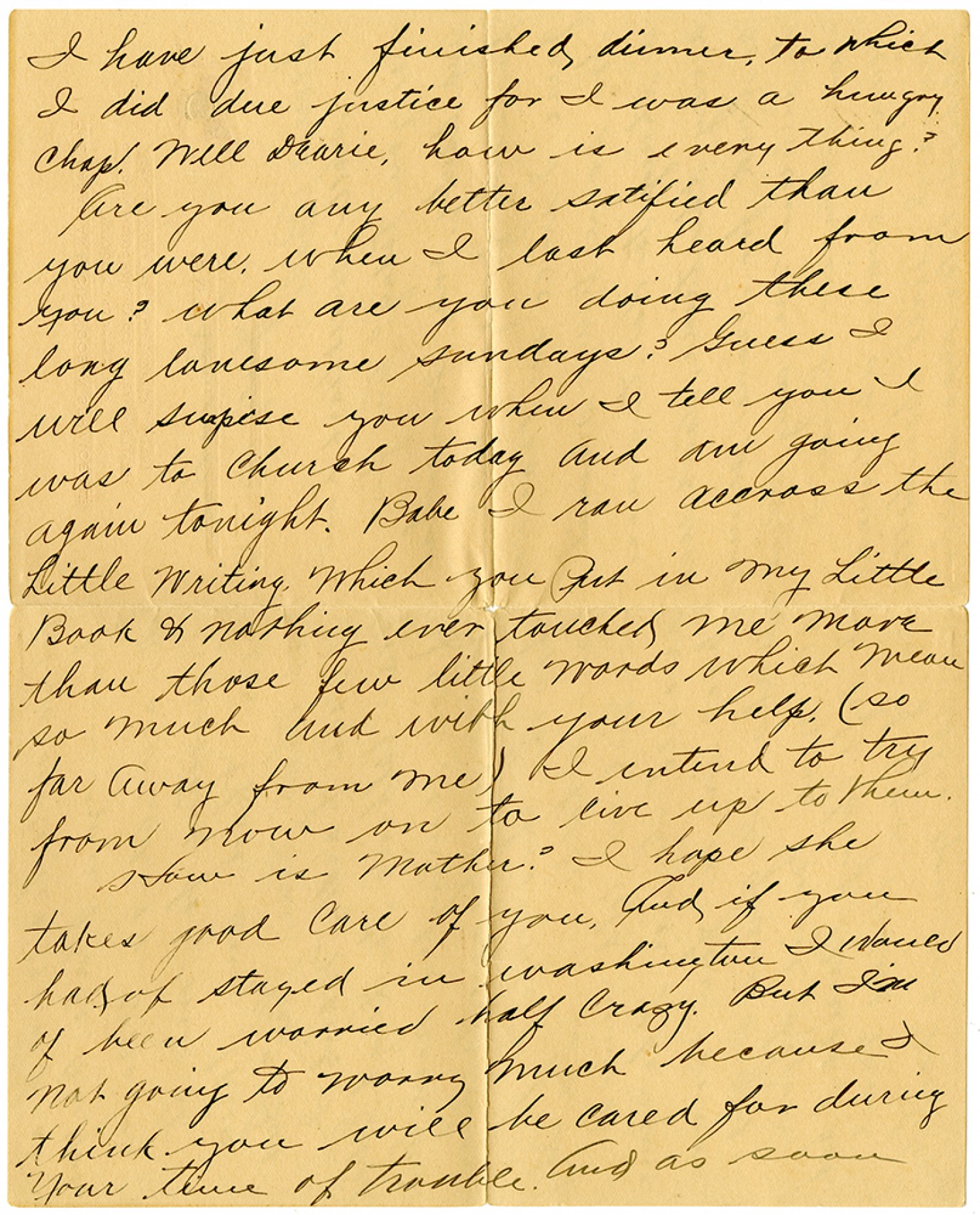 I have just finished dinner to which I did due justice for I was a hungry chap. Well Dearie, how is every thing? Are you any better satified than you were when I last heard from you? what are you doing these long lonesome sundays? Guess I will surprise you when I tell you I was to church today and am going again tonight. Babe I ran accross the Little writing which you put in my Little Book & nothing ever touched me more than those few little words which mean so much and with your help. (so far away from me) I entered to try from now on to live up to them. How is Mother? I hope she takes good care of you, and if you had of stayed in Washington I would of been worried half crazy. But I'm not going to worry much because I think you will be cared for during your time of trouble, and as soon