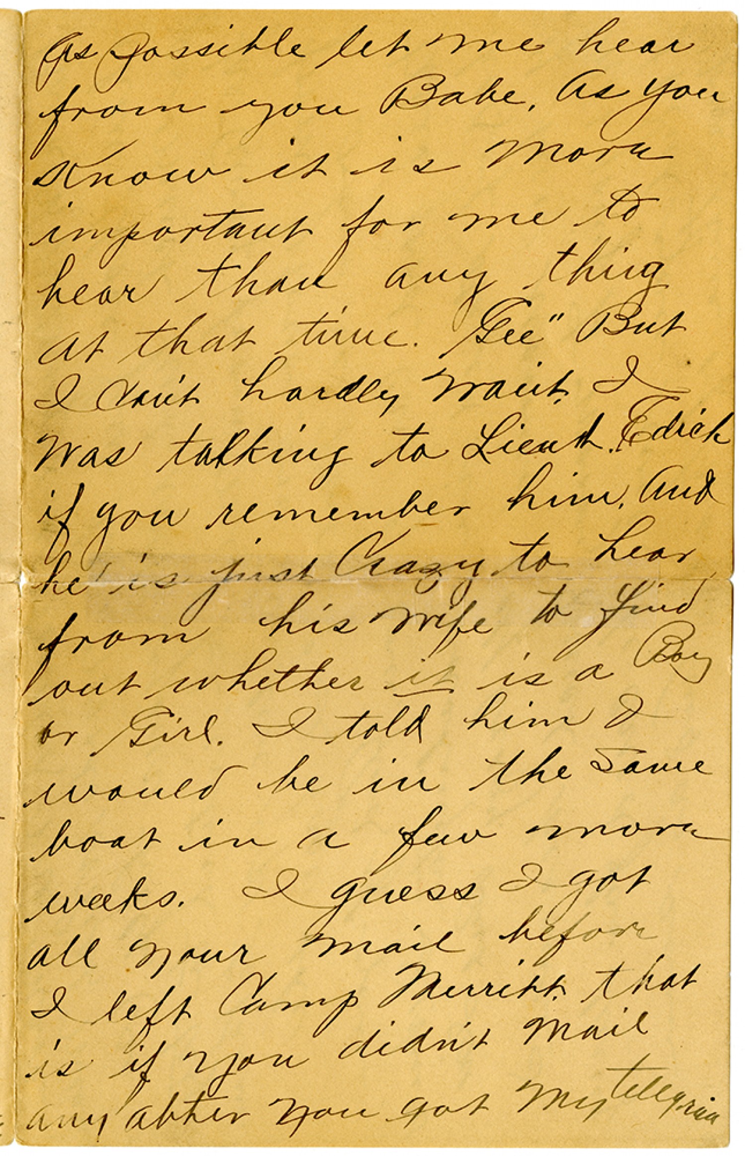 as possible let me hear from you Babe, as you know it is more important for me to hear than any thing at that time. "Gee" But I can't hardly wait. I was talking to Lieut Edich if you remember him, and he is just crazy to hear from his wife to find out whether it is a Boy or Girl. I told him I would be in the same boat in a few more weeks. I guess I got all your mail before I left Camp Merritt that is if you didn't mail any after you got my telegram