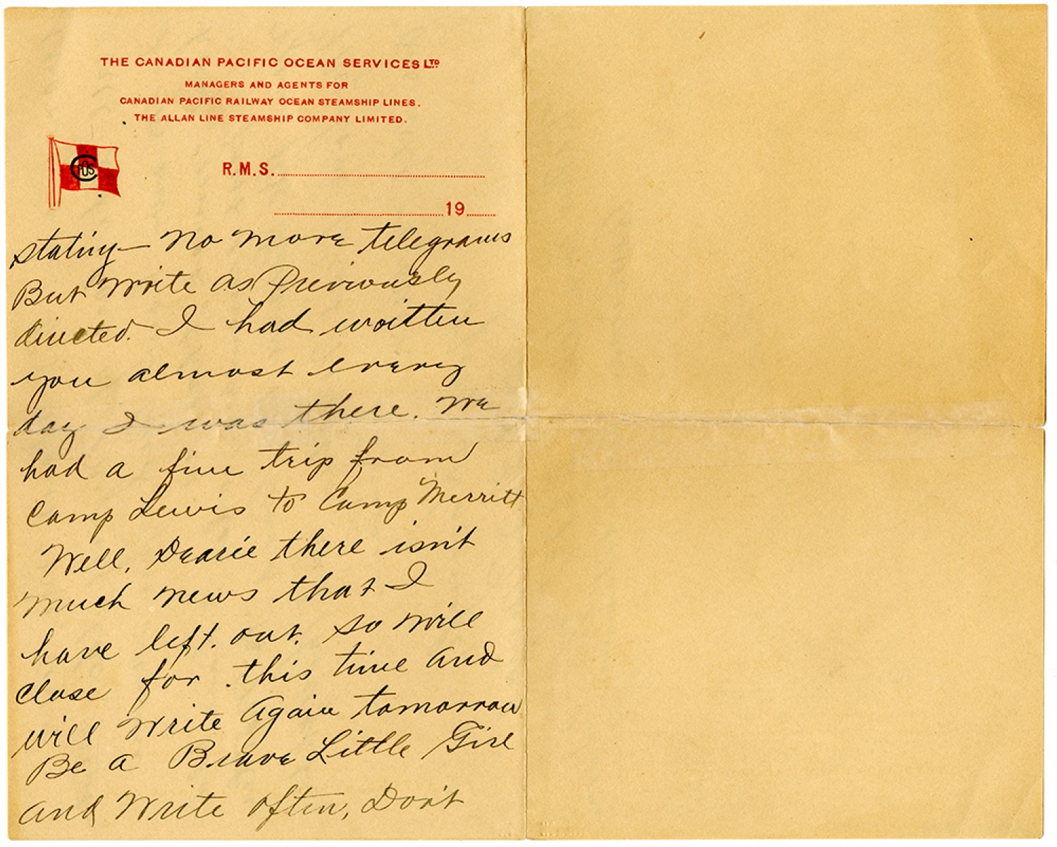 stating - no more telegrams But write as previously directed. I had written you almost every day I was there. We had a fine trip from Camp Lewis to Camp Merritt Well, Dearie there isn't much news that I have left out so will close for this time and will write again tomorrow Be a Brave Little Girl and write often. Don't