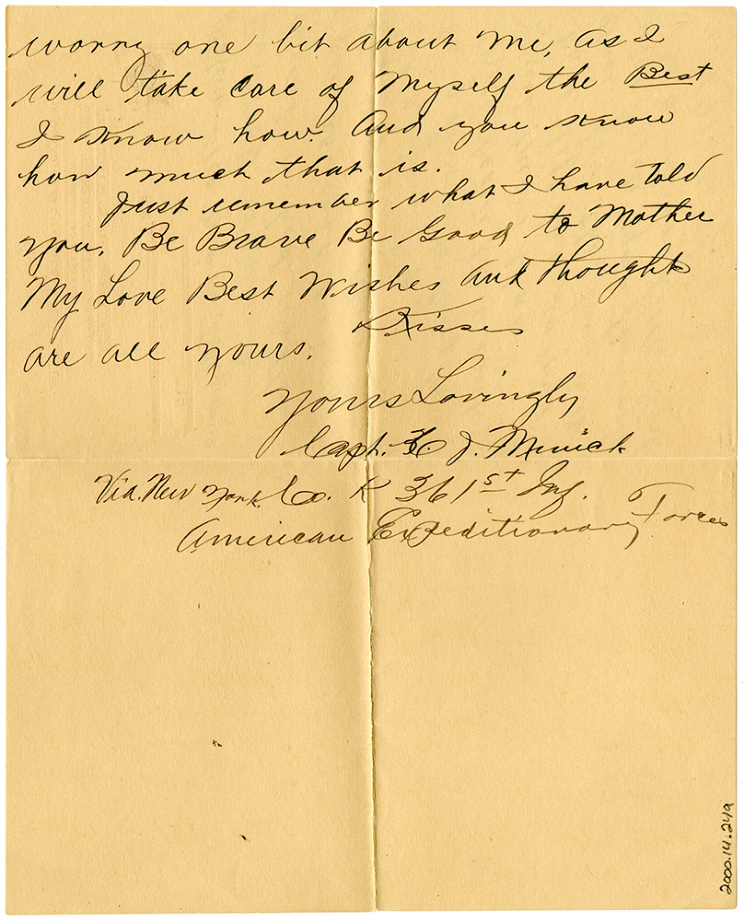 worry one bit about me, as I will take care of myself the Best I know how. And you know how much that is. Just remember what I have told you. be Brave Be Good to Mother My Love Best Wishes and thought are all yours. Kisses Yours Lovingly Capt. C.J. Minick Via New York Co. K 361st Inf. American Expeditionary Forces