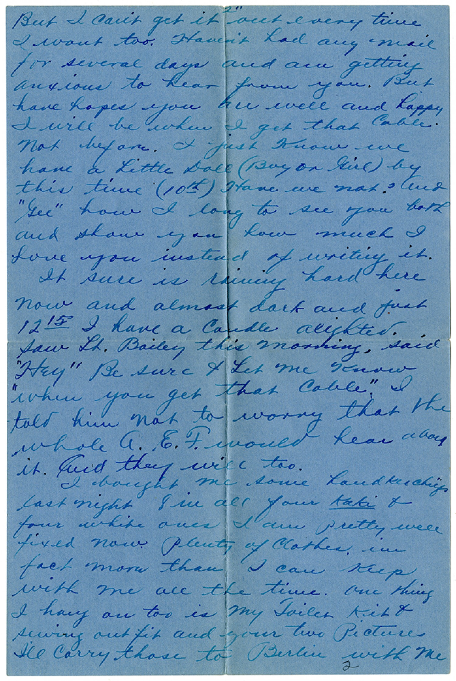 [page 2] But I can't get it out every time I want too. Haven't had any mail for several days and am getting anxious to hear from you. But have hopes you are well and happy I will be when I get that cable. Not before. I just know we have a Little Doll (Boy or Girl) by this time (10th) Have we not? And "Gee" how I long to see you both and show you how much I Love you instead of writing it. It sure is raining hard here now and almost dark and just 12:15 I have a candle alighted. Saw Lt. Bailey this morning, said "Hey" Be sure & Let me know "when you get that cable." I told him not to worry that the whole A.E.F. would hear about it, and they will too. I bought me some handkerchiefs last night 8 in all four kaki & four white ones I am pretty well fixed now. Plenty of clothes, in fact more than I can keep with me all the time. one thing I hang on too is my Toilet Kit & sewing out fit and your two pictures I'll carry those to Berlin with me