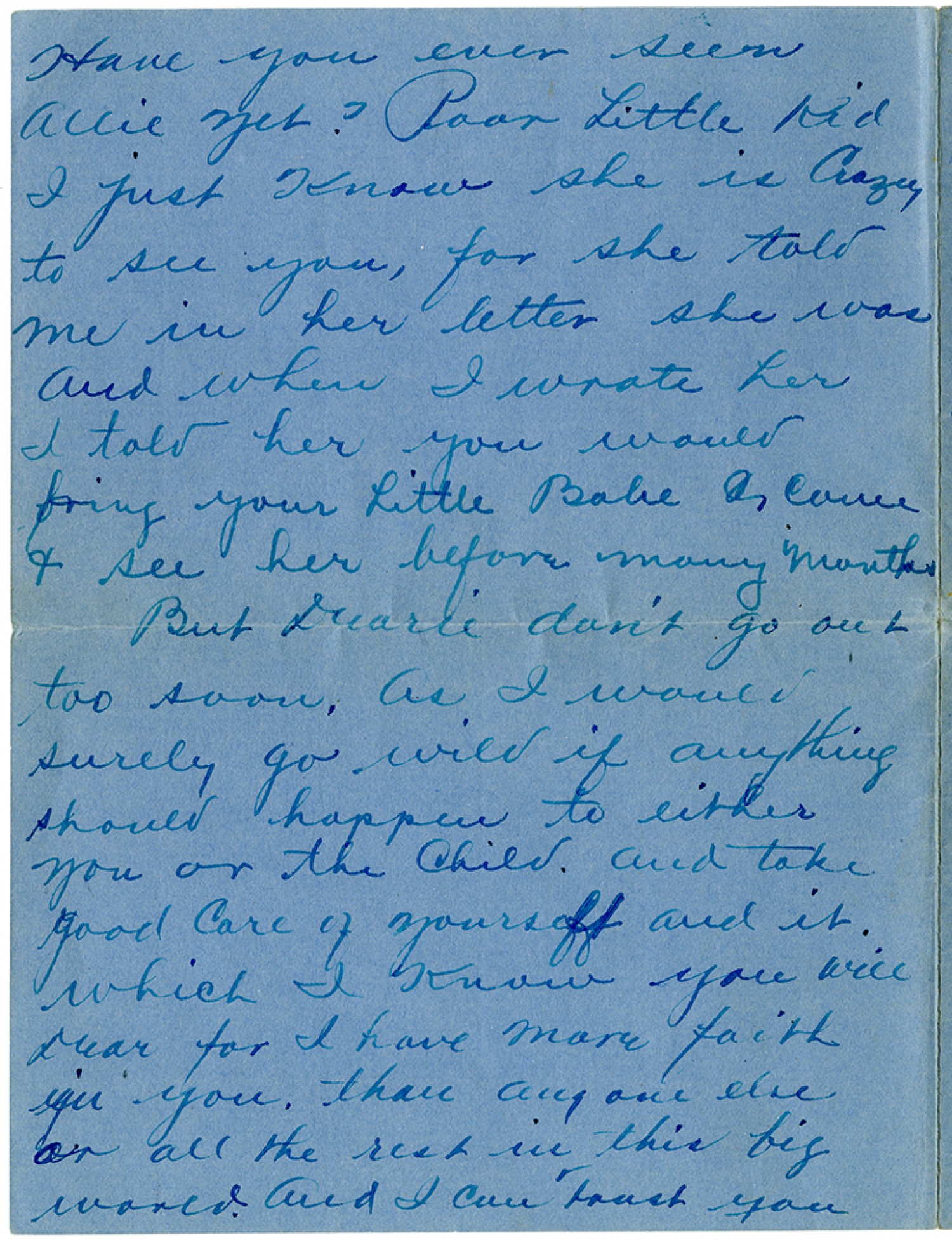 Have you ever seen Allie yet? Poor Little Kid I just know she is crazy to see you, for she told me in her letter she was and when I wrote her I told her you would bring your Little Babe & come & see her before many months But Dearie don't go out too soon. As I would surely go wild if anything should happen to either you or the child. and take good care of yourself and it. which I know you will Dear for I have more faith in you than anyone else or all the rest in this big world. And I can trust you