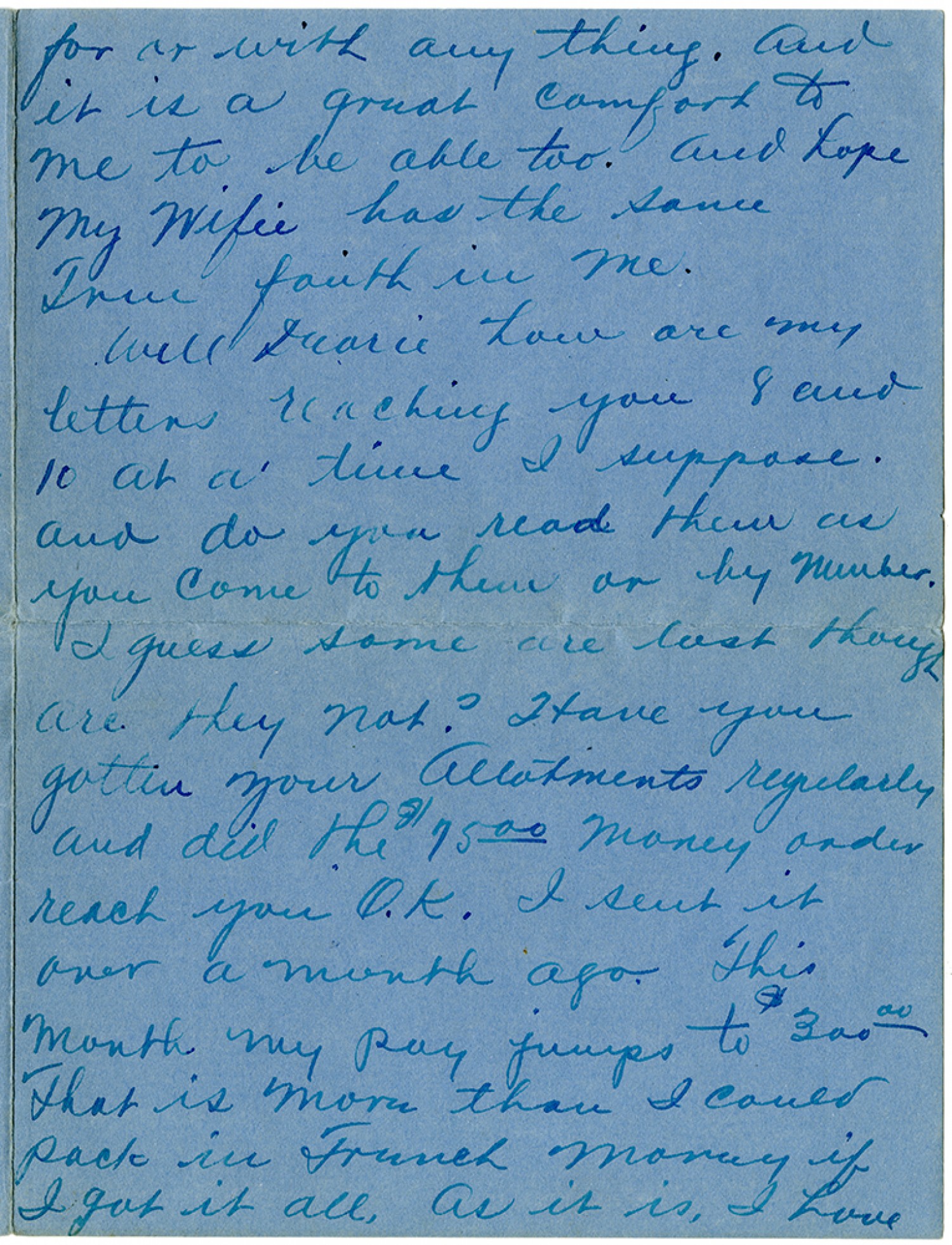 for or with any thing. And it is a great comfort to ne to be able too. And hope my wifie has the same true faith in me. Well Dearie how are my letters reaching you 8 and 10 at a time I suppose. and do you read them as you come to them or by number. I guess some are lost though are they not? Have you gotten your allotments regularly and did the $75.00 money order reach you O.K. I sent it over a month ago. This month my pay jumps to $300.00 That is more than I could pack in French money if I got it all, as it is, I have