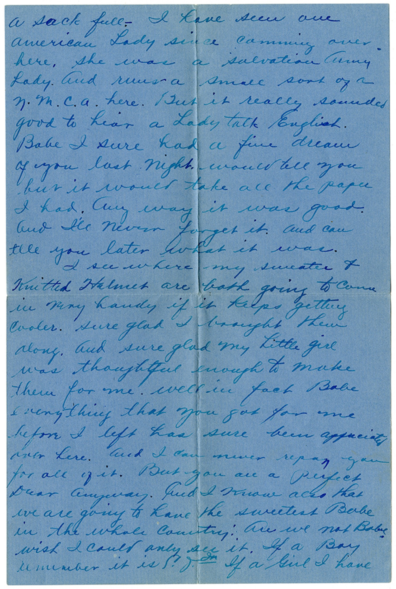 a sack full.- I have seen one american Lady since comming over here. she was a salvation Army Lady and runs a small sort of a Y.M.C.A. here. But it really sounded good to hear a Lady talk English. Babe I sure had a fine dream of you last night. would tell you but it would take all the paper I had. Any way it was good and I'll never forget it and can tell you later what it was. I see where my sweater & knitted Helmet are both going to come in very handy if it keeps getting cooler. sure glad I brought them along. and sure glad my Little girl was thoughtful enough to make them for me. well in fact Babe everything that you got for me before I left has sure been appreciated over here. and I can never repay you for all of it. But you are a perfect Dear anyway. And I know also that we are going to have the sweetest Babe in the whole country! Are we not Babe wish I could only see it. If a Boy remember is C. J. Jr If a Girl I have